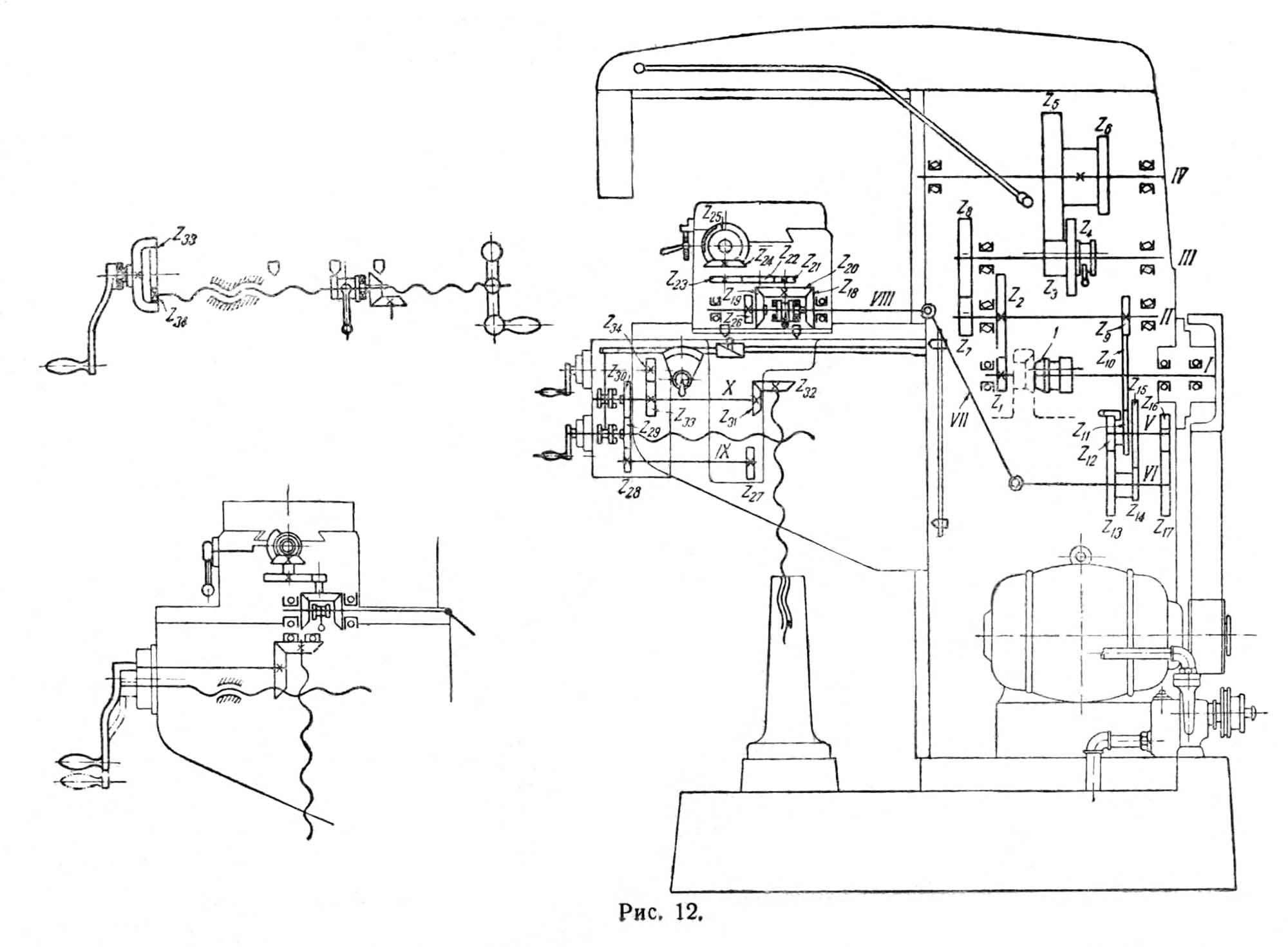 Вертикальная подача осуществляется посредством шестерни Z30 (сцепленной з Z29), свободно сидящей на валу X. На етом же валу жестко закреплена коническая шестерня Z31, постоянно сцепленная з конической шестерней Z32.