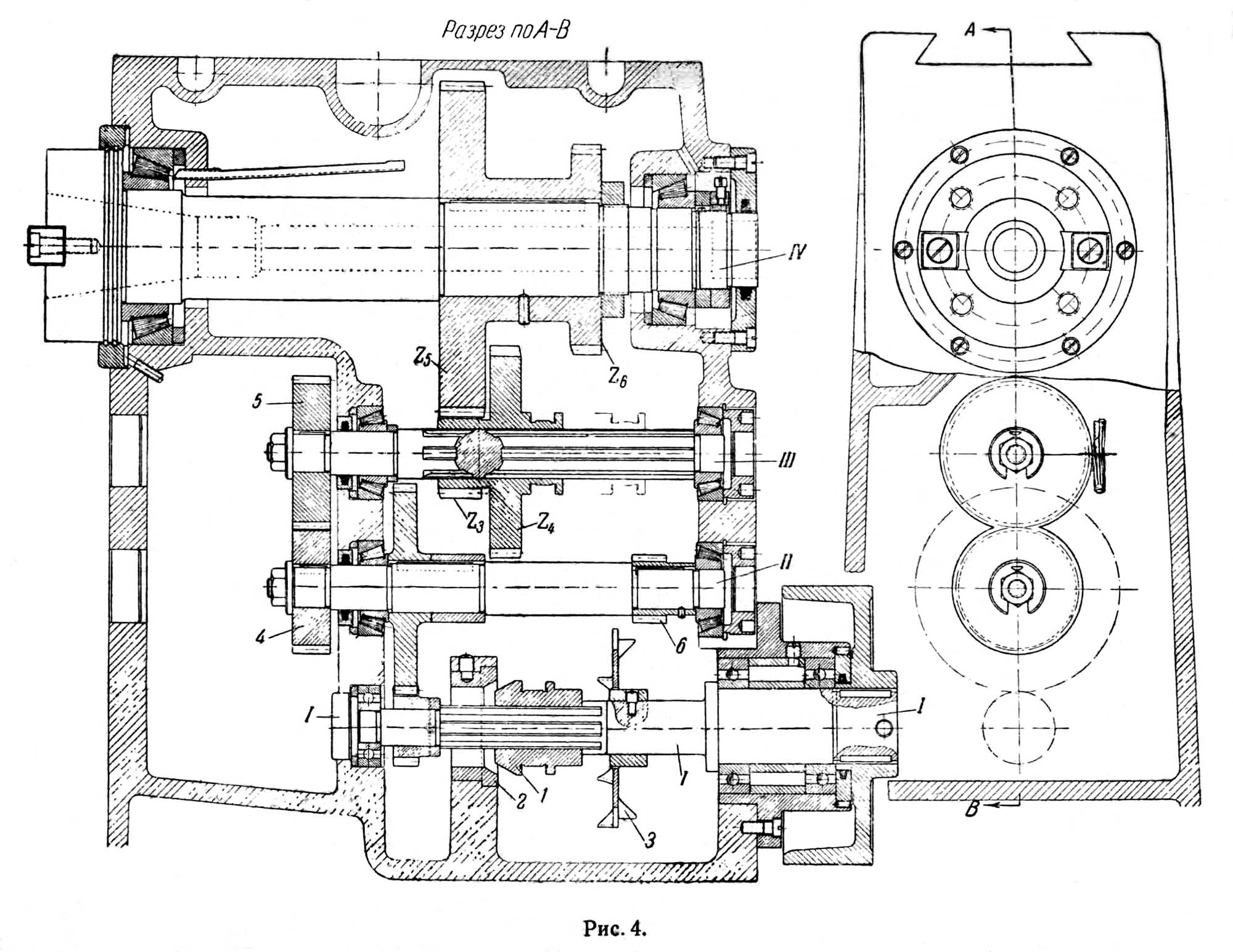 По шестишпоночной частини вала III передвигается двойная шестерня Z3—Z4 (см. рис. 4), сцепляющаяся соответственно со второй двойной шестерней Z5—Z6, жестко закрепленной на шпинделе IV.