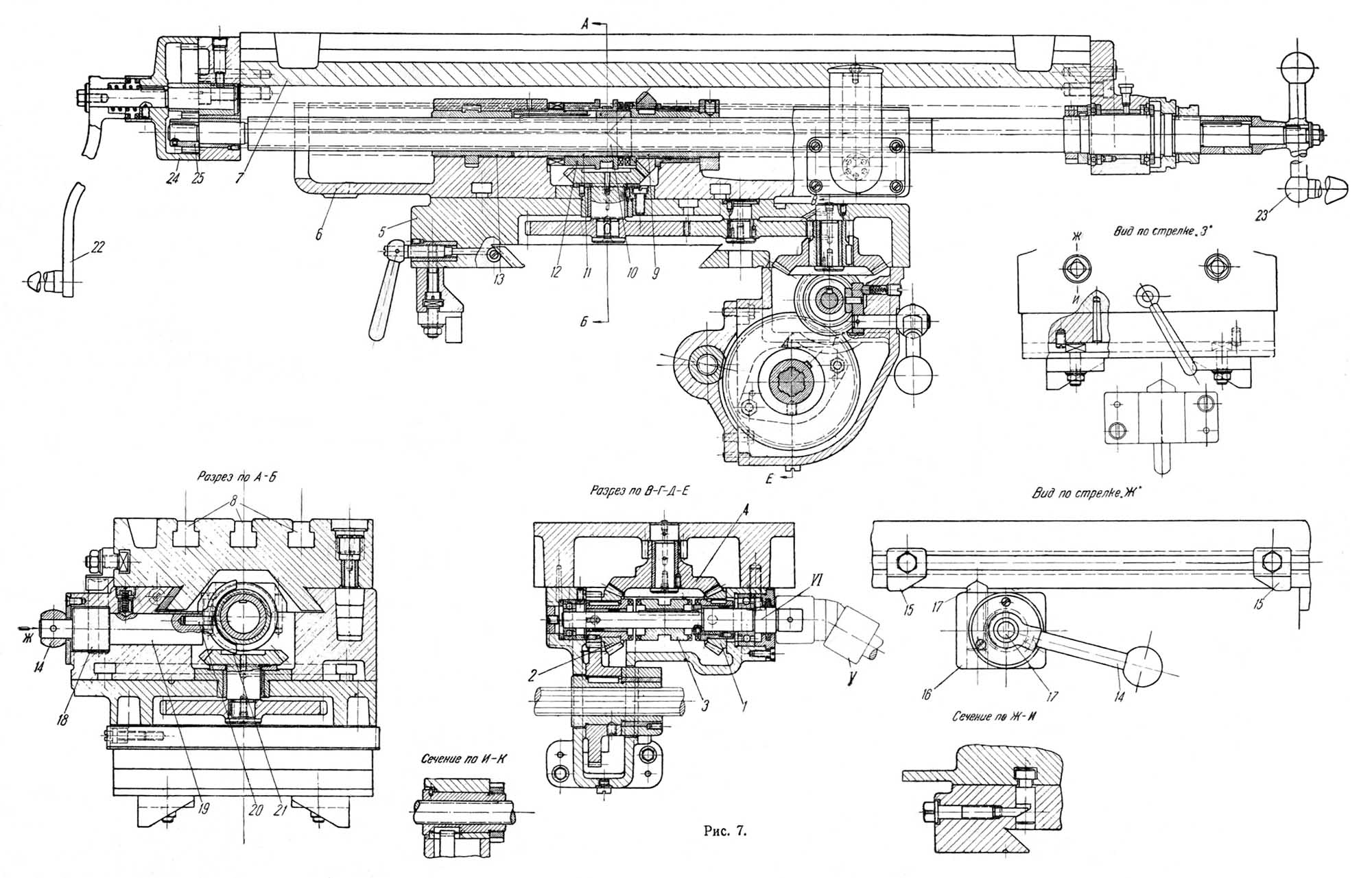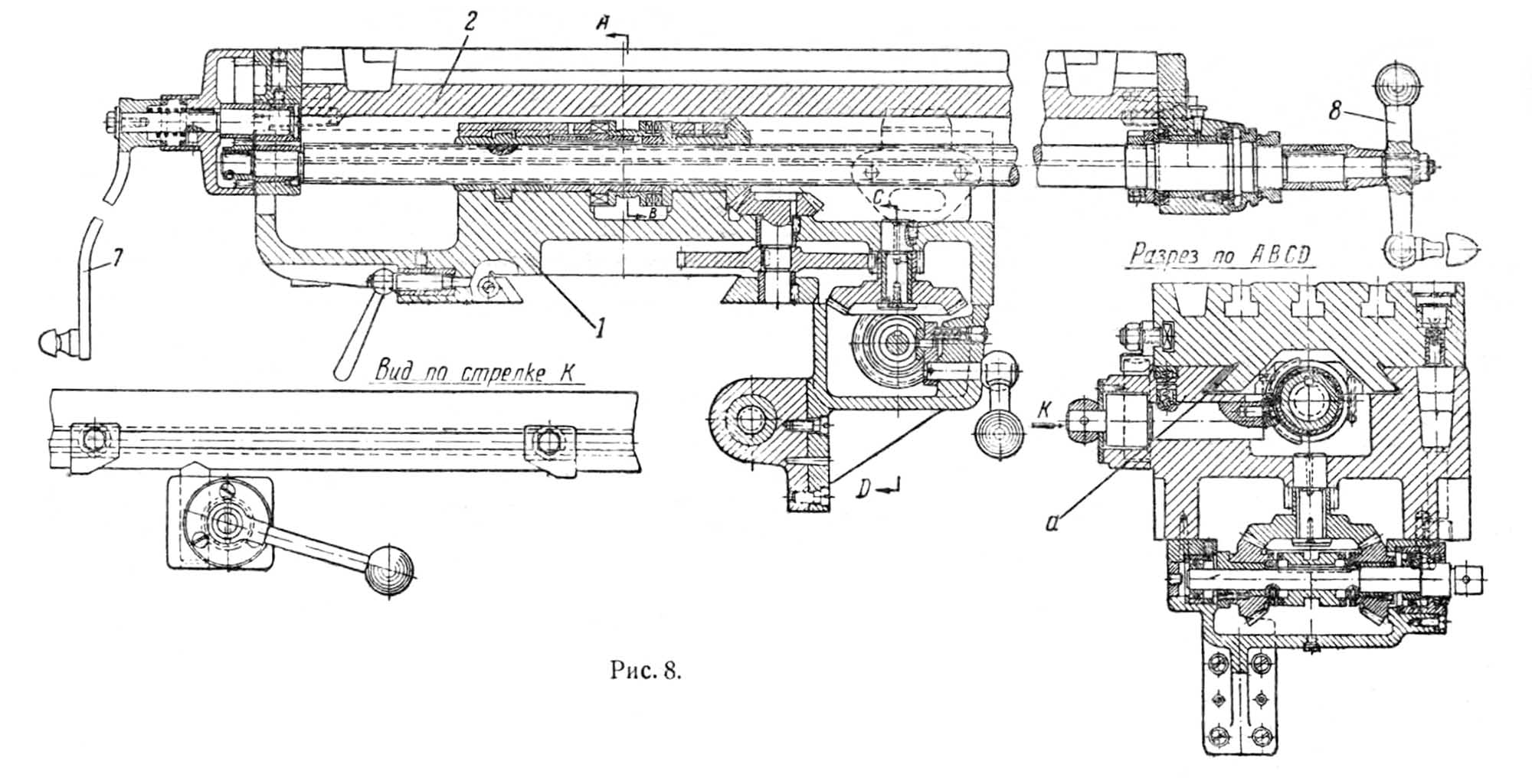 Последняя коническая шестерня етой системы жестко связана з кулачковой втулкой 9, скользящей по ходовому винту 10 поздовжньої подачі.