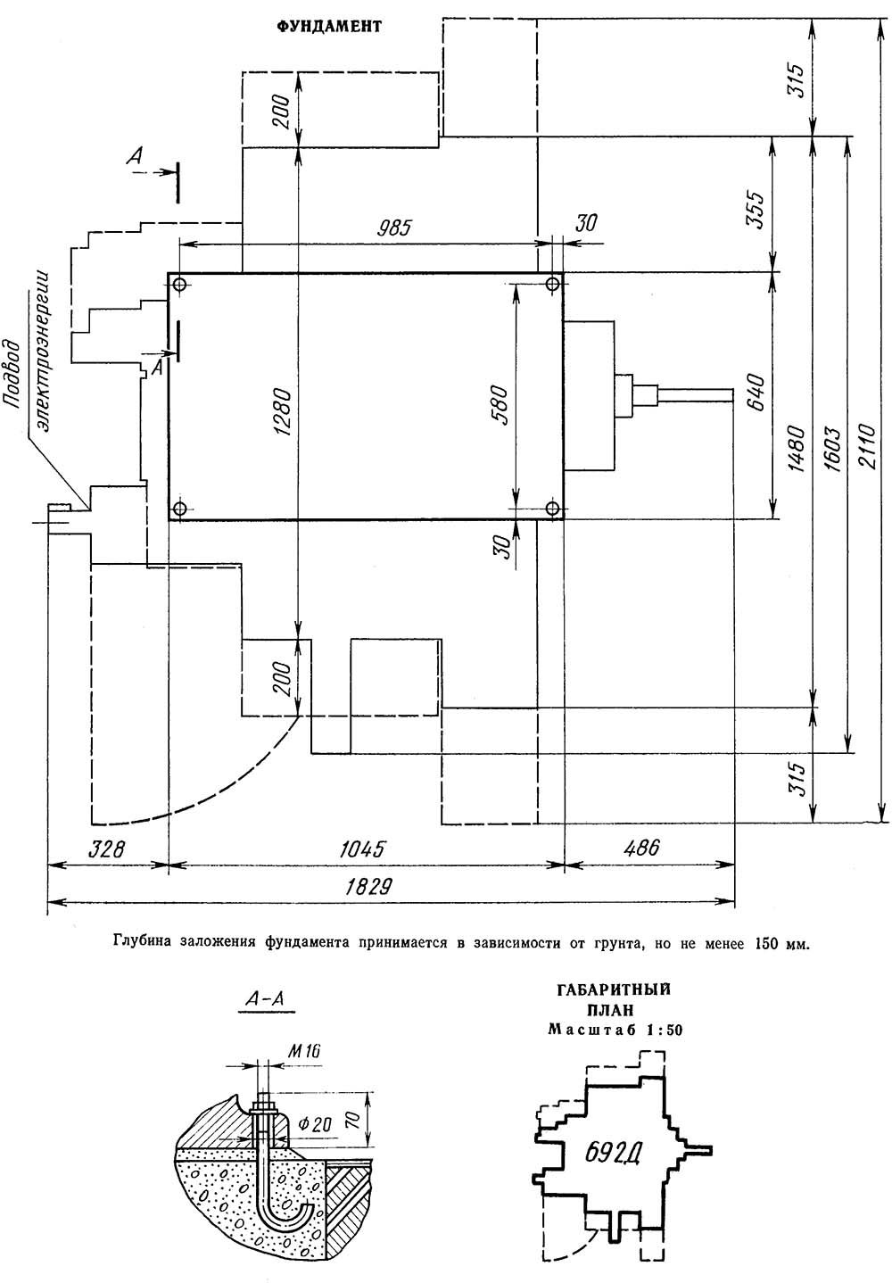 Габаритные розміри робочого простору і посадочные базы верстата 692Д. Скачать в увеличенном масштабе