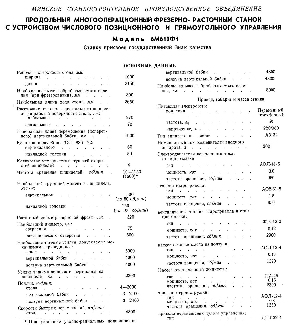 Технічні характеристики продольно-фрезерного верстата 6М610
