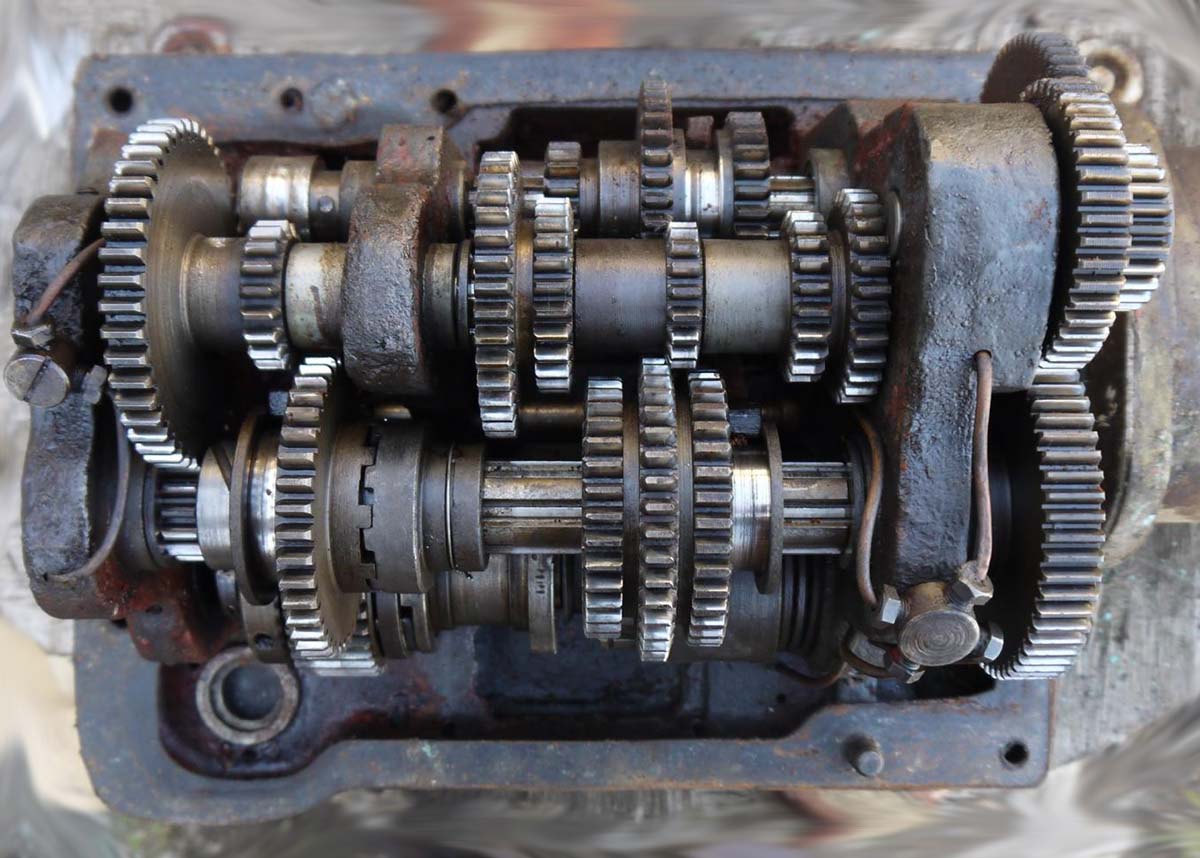 Муфта 6 може перемещаться на шпонке 4 вдоль втулки 5, которая нерухомо сидит на шпонке на фрикционном валу 14. При перемещении муфты 6 влево она сцепляется з кулачковой втулкой 3 зубчатого колеса 2 (z=40), находящегося в постоянном зацеплении з зубчатым колесом 1 (z=40) перебора коробки подач; таким образом, фрикционный вал получает от коробки подач 18 различных швидкостей в зависимости от положения переключаемых зубчатых колес коробки подач.