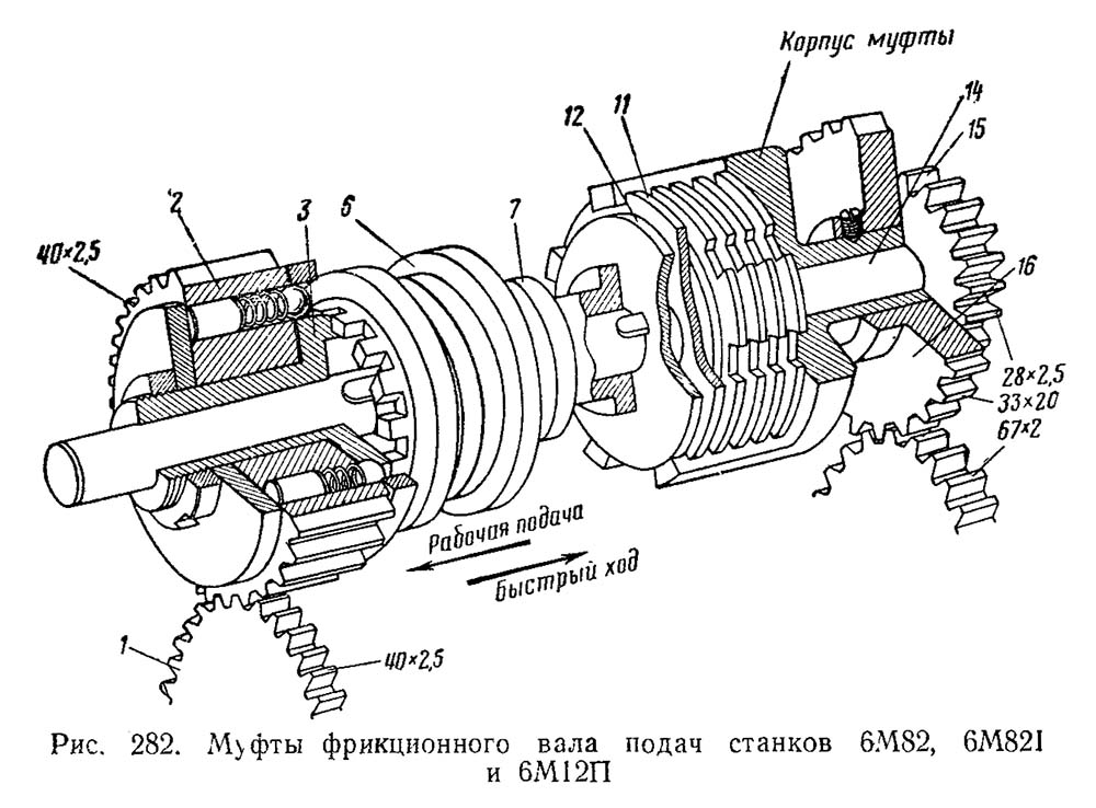 На рис. 282 показаны муфты фрикционного вала подач; для удобства обозначения на рис. 282 соответствуют обозначениям на рис. 280.