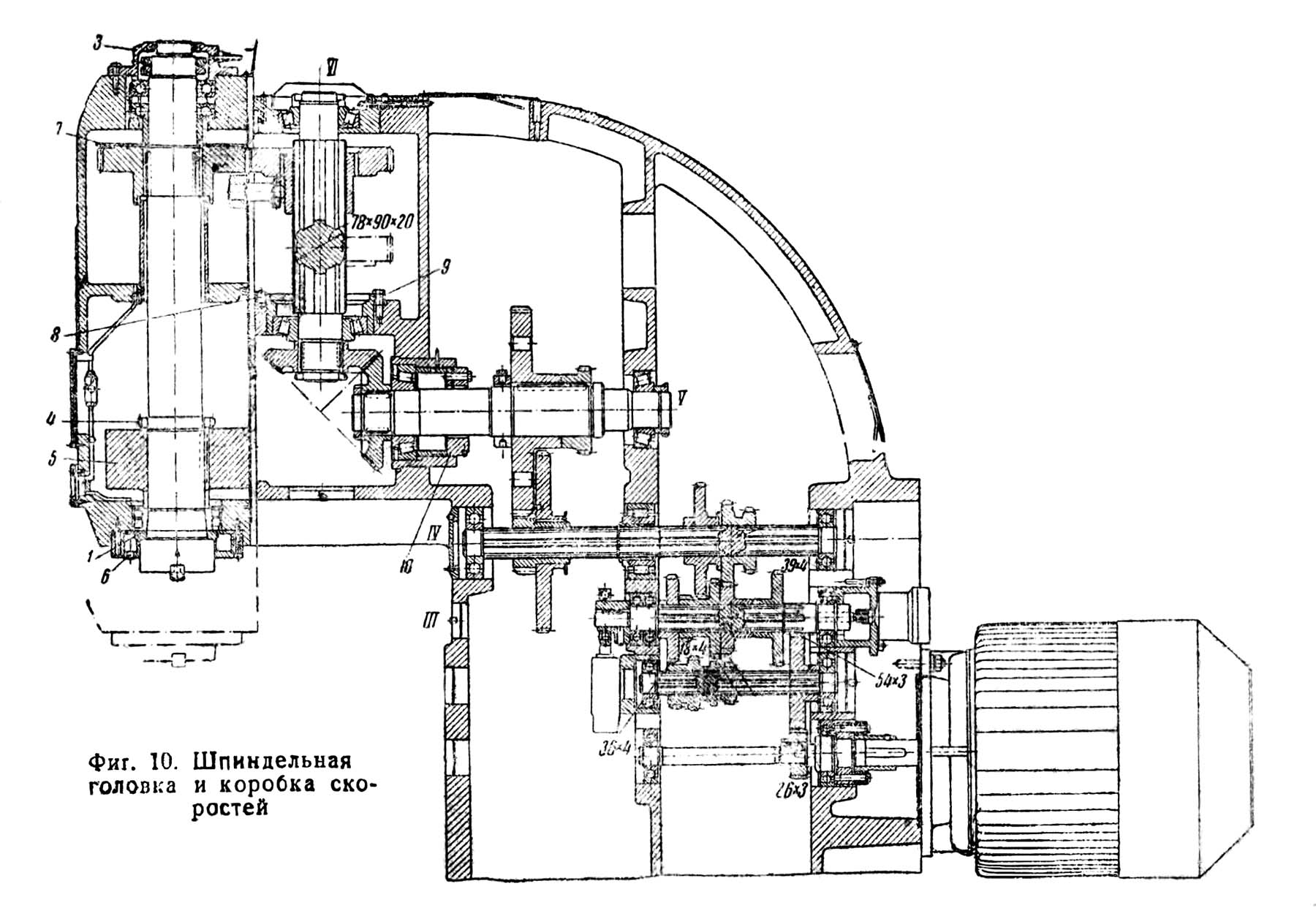Шпиндель получает вращение от фланцевого електродвигуна мощностью 10 кВт через упругую соединительную муфту, 18- скоростную коробку швидкостей і через коническую і цилиндрическую пары шестерен (фиг. 2).