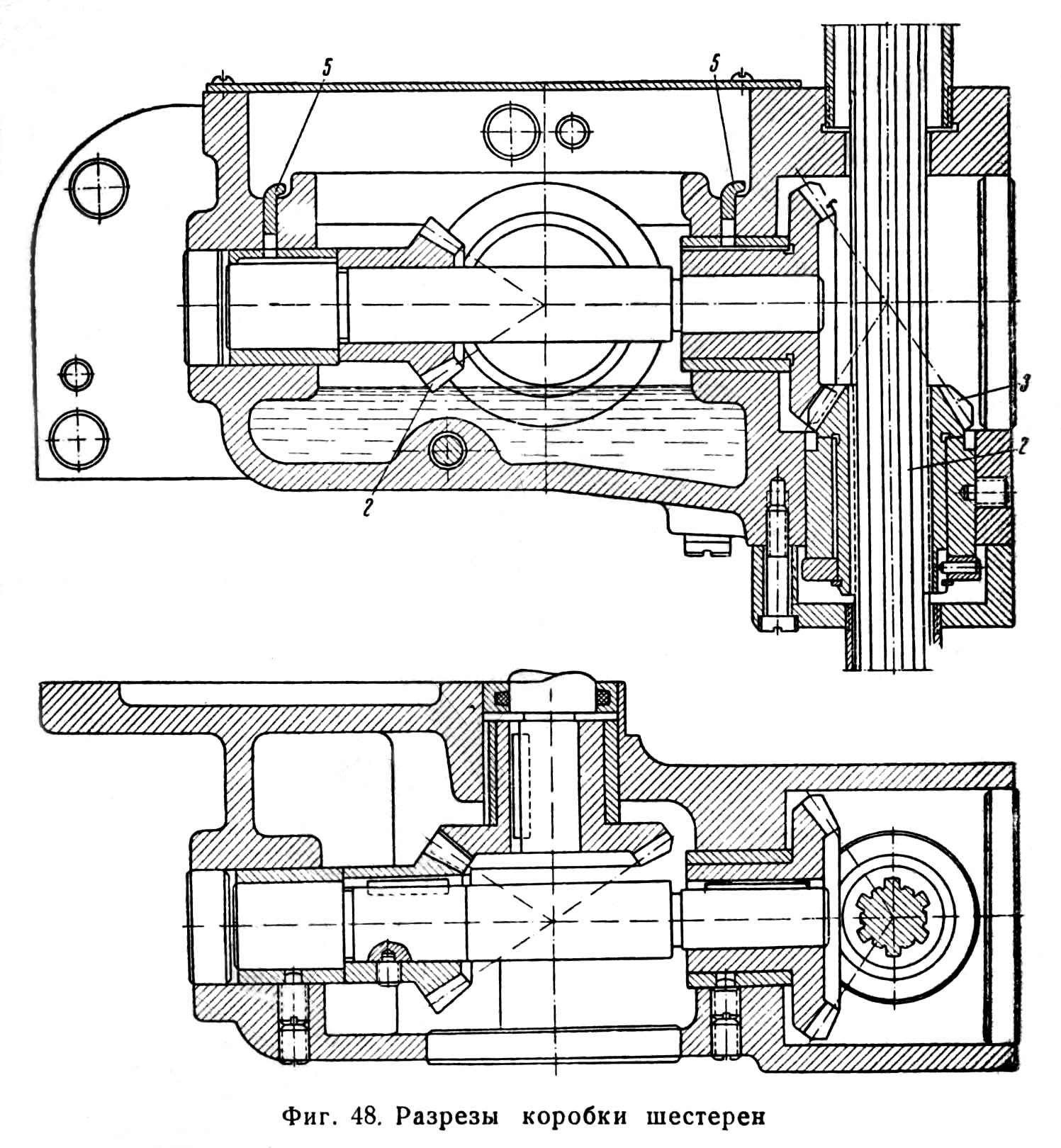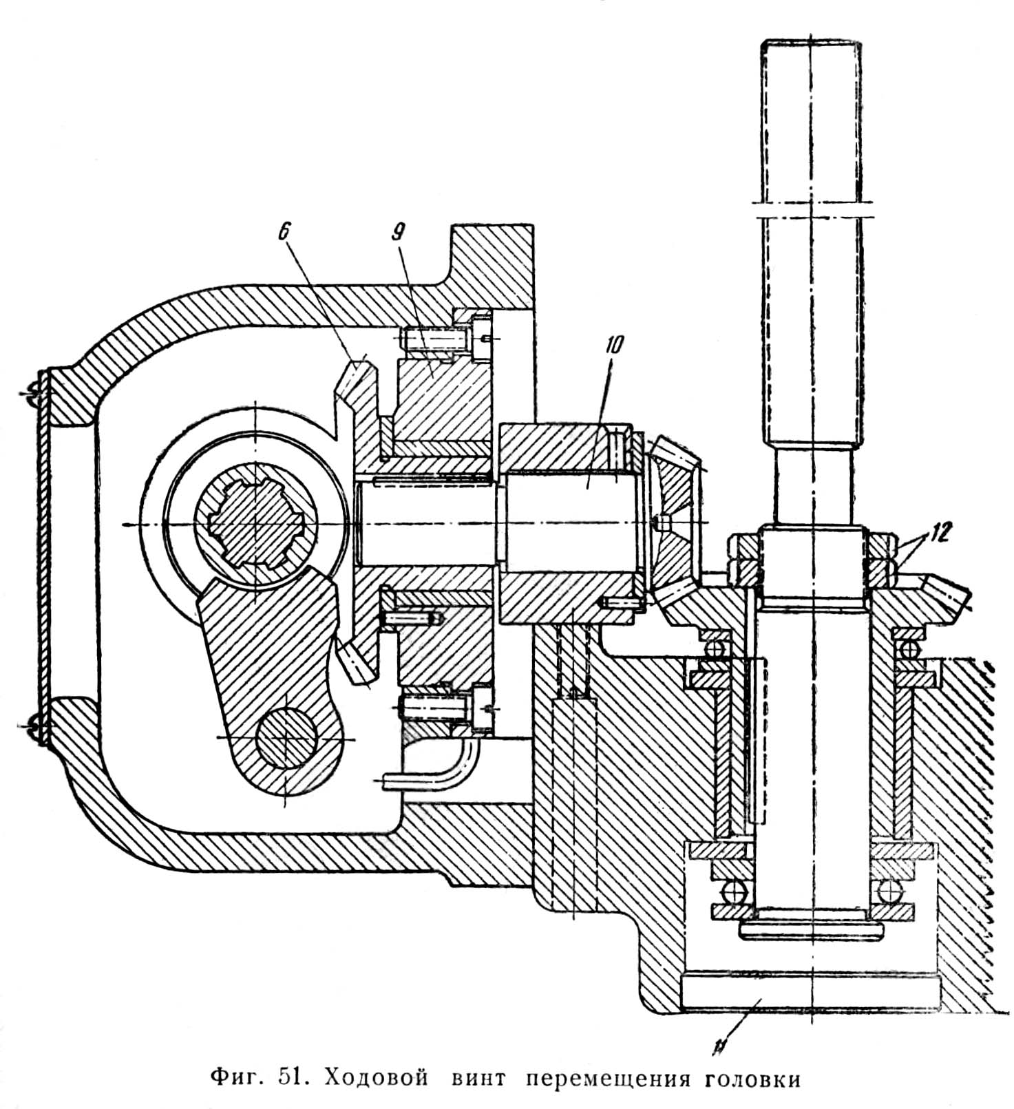 Масло от маслораспределителя подается ко всем пяти втулкам конических шестерен, смазывая одновременно і места зацепления шестерен. Отвод масла осуществляется через фланец 2 (см. фиг. 50), в который запрессована ступенчатая втулка, образующая маслосборник, откуда масло отводится через медную трубку 24 в станину. На шейке шлицевого вала напрессовано кольцо 25, образующее вместе з втулкой лабиринт, препятствующий попаданию масла на шлицевой вал. Втулка переднего кінця вала ручного переміщення головки смазывается периодически (1 раз в смену) через шариковую масленку 26.