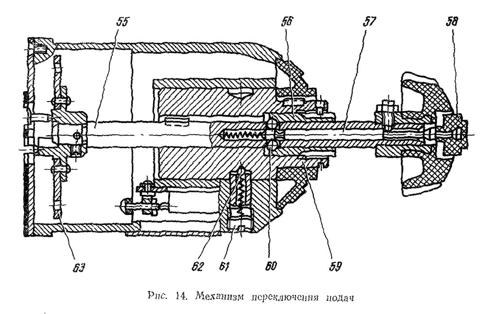 Для предотобертання смещения диска 63 (рис. 14) в осевом направлении валик 55 запирается во включенном положении двумя шариками 60 і втулкой 56. Попадая в кольцевую проточку валика 57, шарики освобождают от фиксации валик 55 при нажиме на кнопку 58.