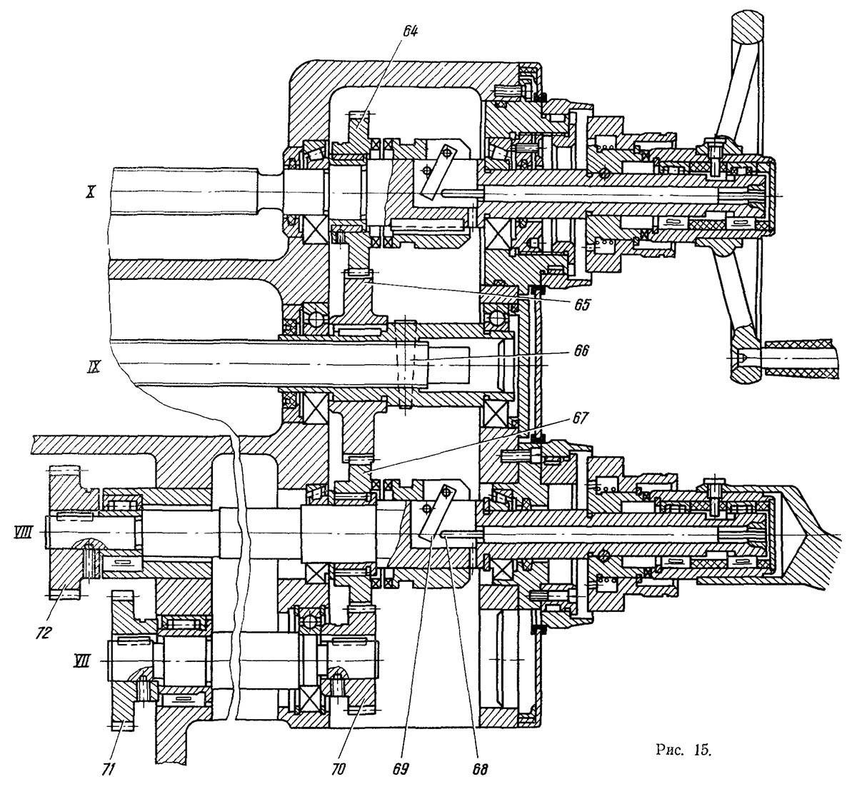 Зубчатое колесо 65, смонтированное на гильзе, через шпонку і шлицы постоянно вращает шлицевой вал IX ланцюги продольного ходу.