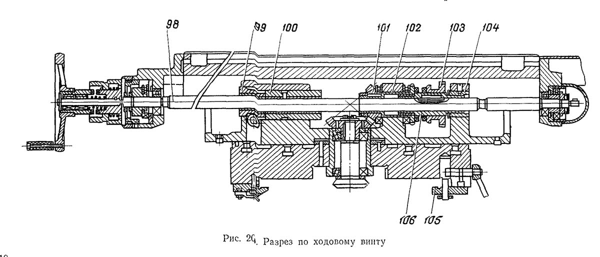 Ходовой винт 98 (рис. 20) получает вращение через скользящую шпонку гильзы 106, смонтированную во втулках 102 і 104. Гильза через шлицы получает вращение от кулачковой муфты 103 при сцеплении її з кулачками втулки 102, жестко связанной з коническим зубчатым колесом 101. Втулка 102 имеет зубчатый венец, з которым сцепляется зубчатое колесо приводу круглого стола. Кулачковая муфта 103 имеет зубчатый венец для осуществления обертання гвинта поздовжньої подачі при переміщеннях от маховичка. Зубчатое колесо 121 (рис. 24) подпружинено на случай попадания зуба на зуб. Зацепление з шестерней 121 може быть только в случае расцепления муфты 103 з втулкой 102 (см. рис. 20).