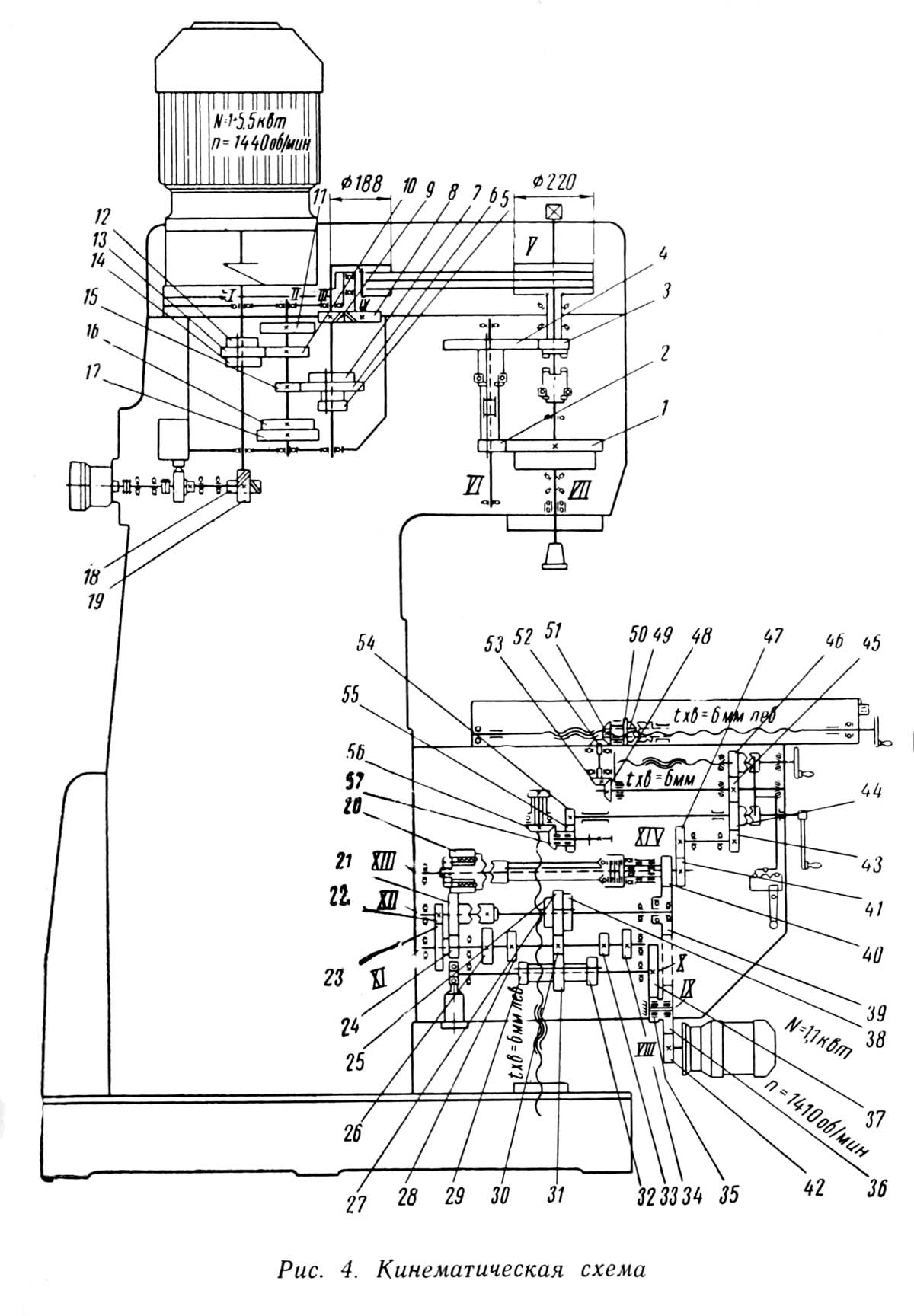 С вала IX рух передається на ланцюг рабочих подач шестернями 35, 37 через вал X і на ланцюг ускоренных ходов при помощи шестерен 36, 39, 40 і вала XIII.