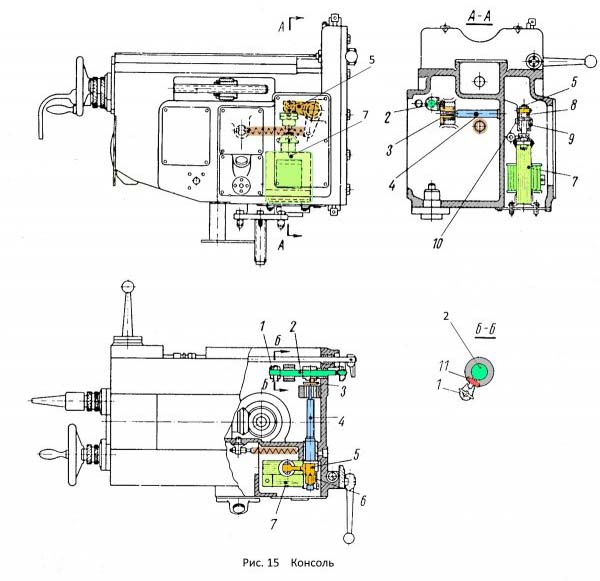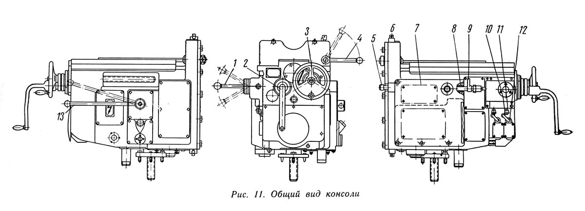 При нажатии кнопки 4КУ происходит увімкнення електромагнита ЭБ, который через систему рычагов включает муфту швидкого ходу. Автоматический останов двигуна подачі при движении стола происходит при переводе кінцівыми кулачками рукоятки 3 (см. рис. 10) в нейтральное положение. Керування поперечными і вертикальными ходуми производится рукояткой консоли з конечными выключателями ЗКВ і 4KB (см. рис. 11, поз. 1 і 12). Увімкнення двигуна подач для получения подачі или ускоренного ходу возможно лишь при вращающемся шпинделе.