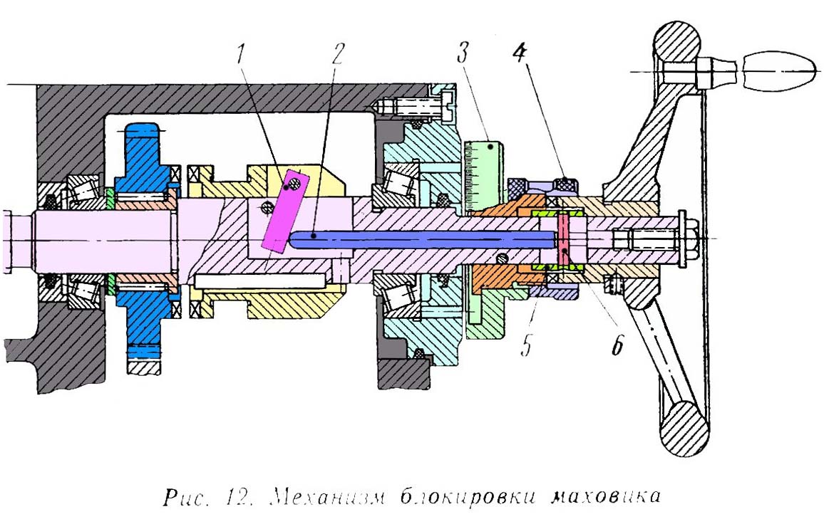 Перемещения кулачковой муфты шпинделя і блока шестерен перебора сблокированы между собой. Увімкнення і вимкнення перебора происходит через систему рычагов 3 при переключении рукоятки 17 (см. рис. 2 і 3). При опускании блока шестерен вниз происходит вимкнення перебора.