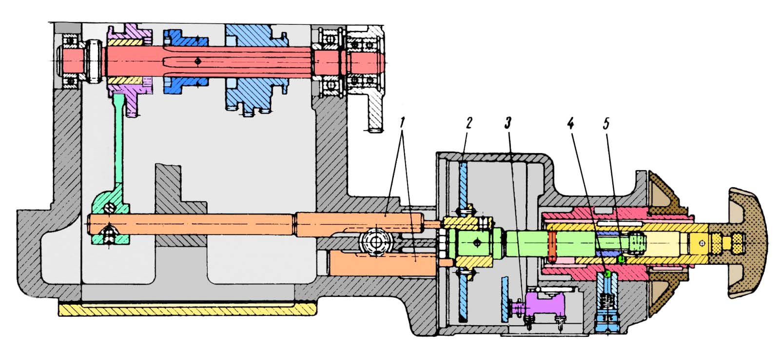 Привід плунжерного насоса, а также реле 5 контроля скорости (см. рис. 5), установленного на задньої крышке станины, осуществляется от первичного вала коробки швидкостей винтовыми шестернями.