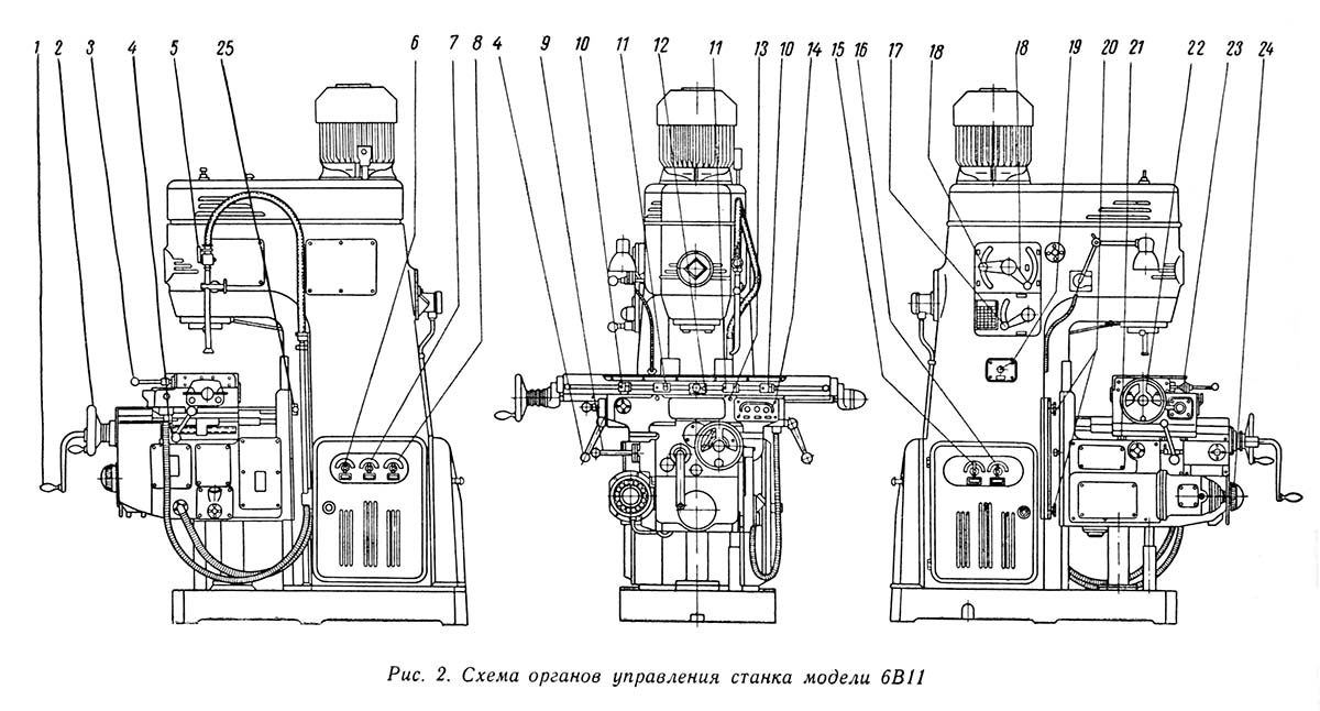 Розташування органів керування фрезерным верстатом моделі 6В11