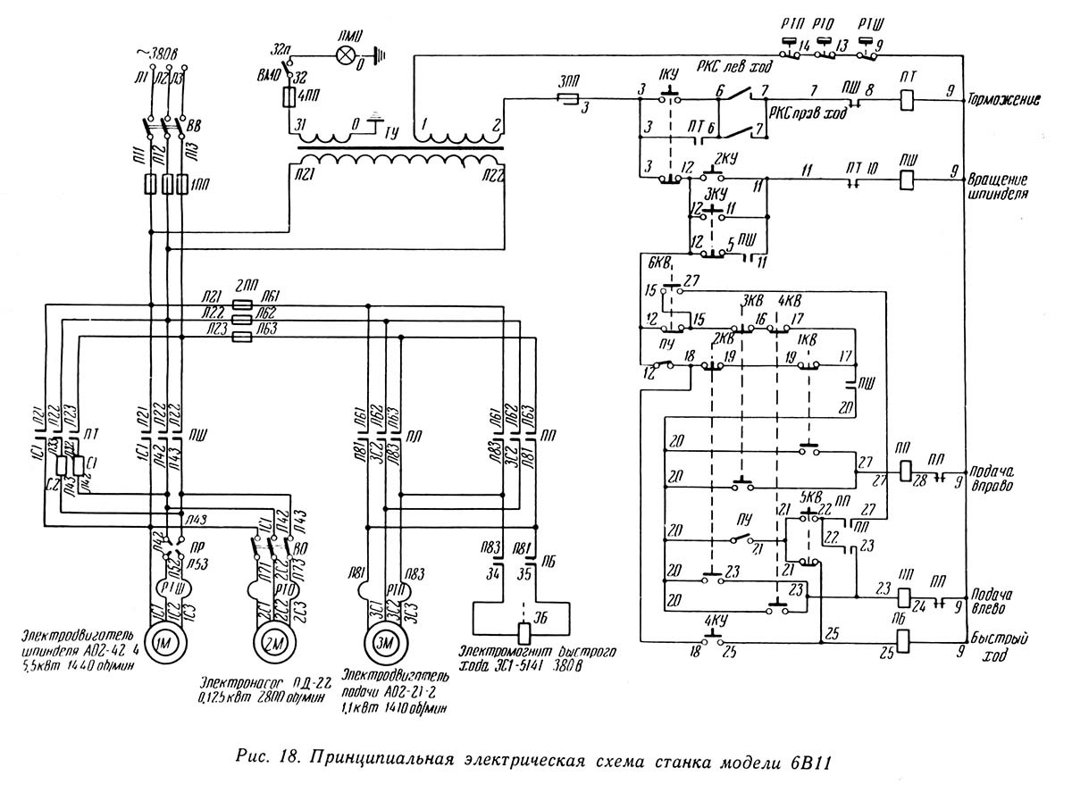 2. В схеме предусмотрено відключення поперечної і вертикальной подач при установці переключателя керування ПУ в положение «керування от кулачков включено». При етом питание ланцюги будет осуществляться через ЗКВ і 4KB (см. рис. 18). При включении поперечної или вертикальной подачі ЗКВ или 4KB ланцюг 15, 16 или 16, 17 размыкается, что вызывает остановку електродвигуна подачі.