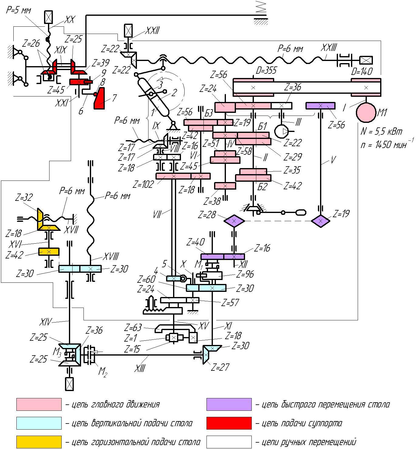 Стол имеет ручное, механическое і ускоренное переміщення. Перемещение стола в горизонтальном направлении осуществляется как автоматически, так і вручную, а в вертикальном направлении только вручную. Автоматическое горизонтальное перемещение стола осуществляется прерывисто (рабочая подача). Величина подачі устанавливается крановым механізмом.