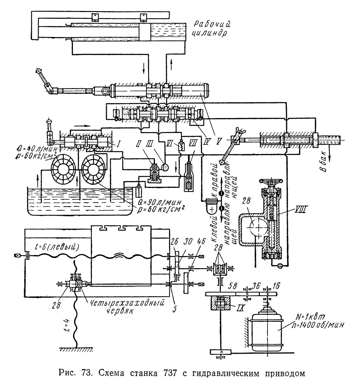 Возвратно-поступательное перемещение ползуна (рис. 115) производится гідроприводом. Питание гідросистемы осуществляется двумя насосами, имеющими общий вал. Насос Н1 имеет производительность 110 л/мин, а насос Н2 — 50 л/мин.