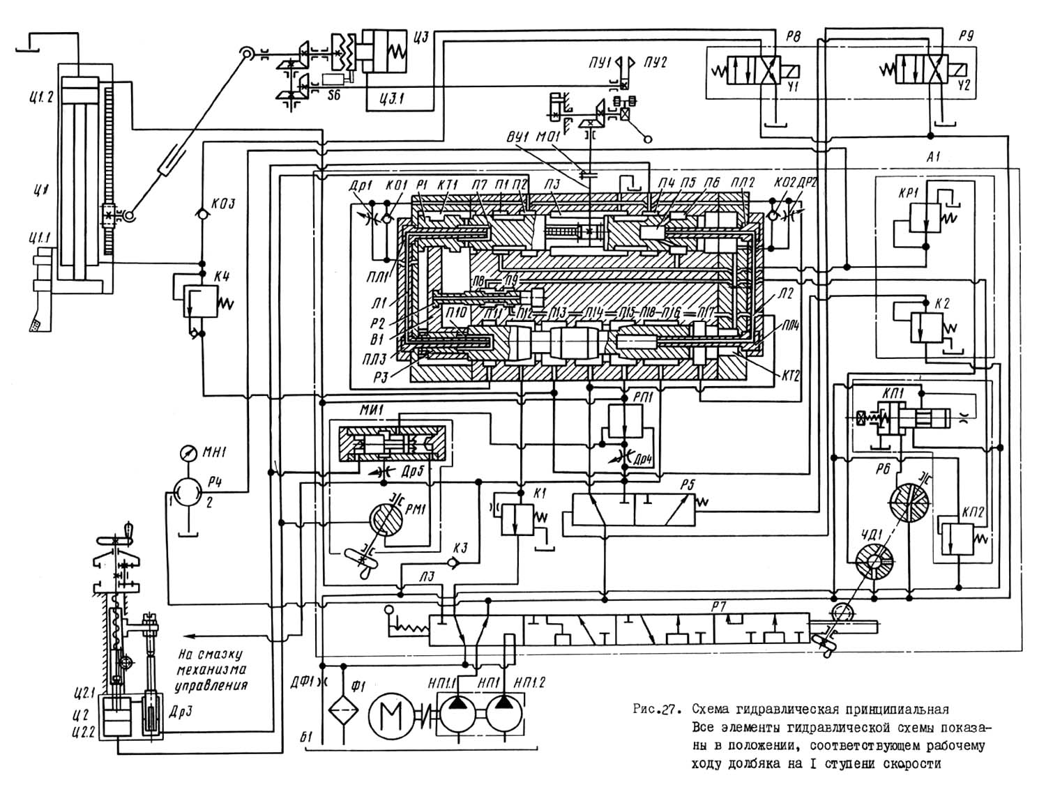 Давление контролируется по манометру МН1, подключенному к бесштоковой полости гідроцилиндра Ц1.2. (при етом дроссели ДР4 і ДР5 панелі должны быть закрыты).
