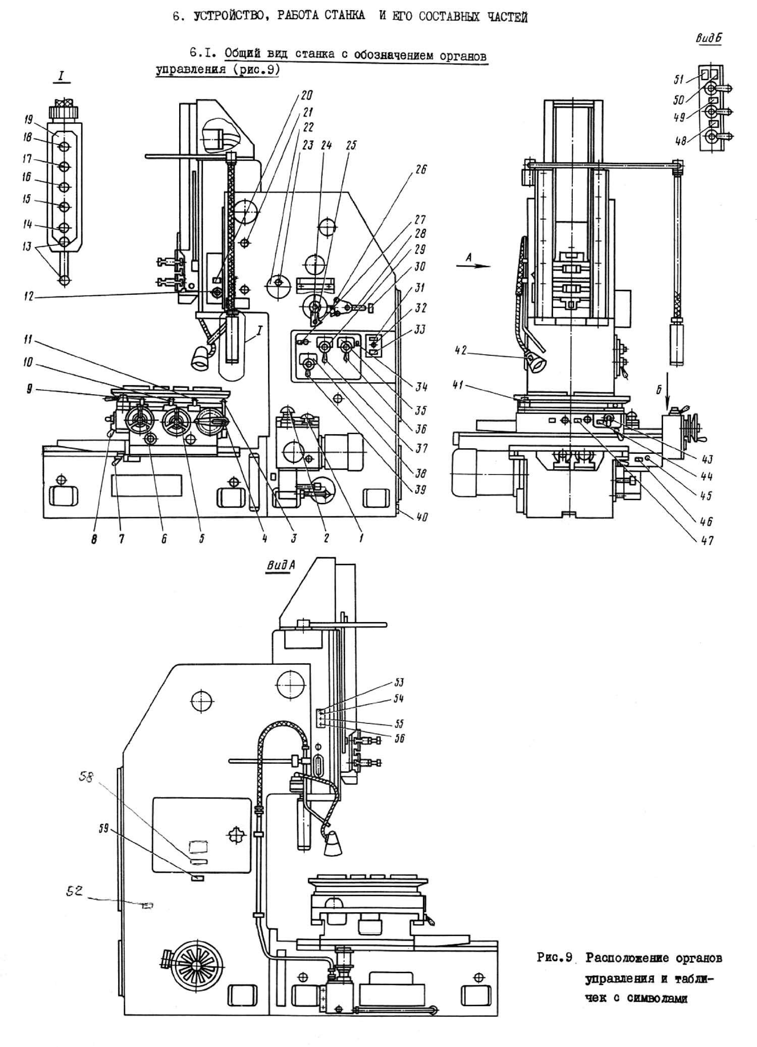 Розташування органів керування долбежным верстатом 7405. Дивитись у збільшеному масштабі