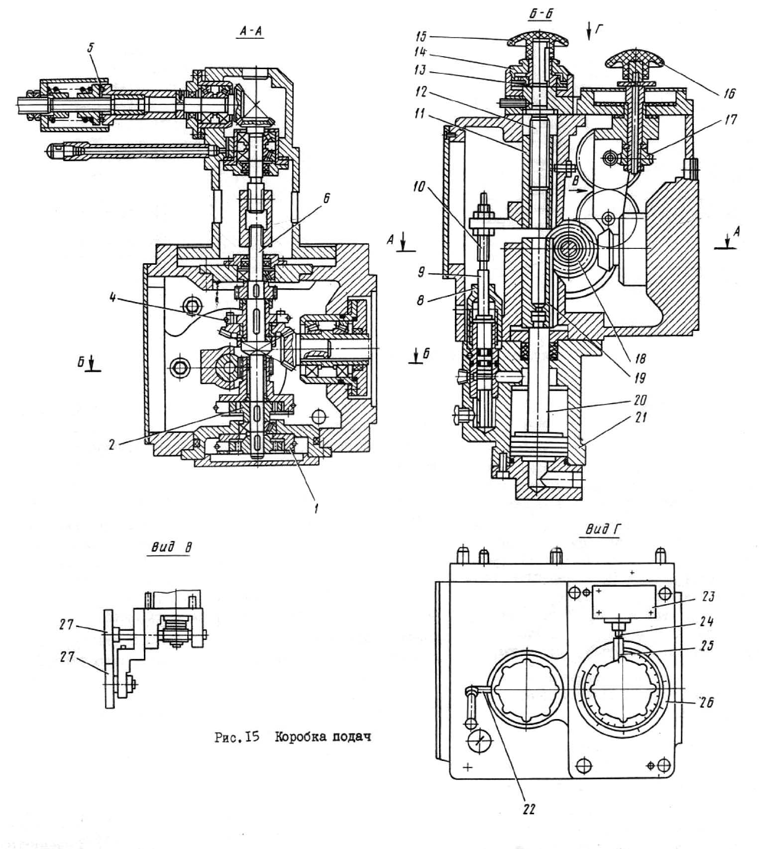 В коробке передач имеется делительный механізм поворота стола, позволяющий делить заготовку на заданное число частин в соответствии з табл.15.