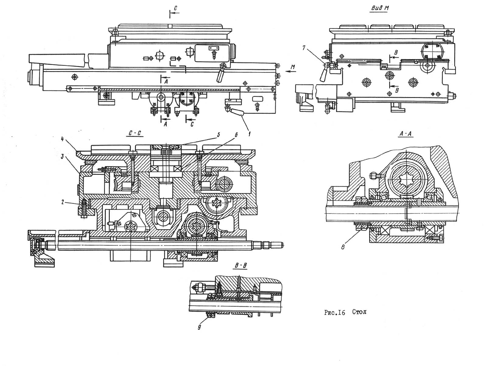 Стол верстата имеет три вида перемещений: продольное, поперечное і круговое. Быстрое установочное перемещение стола в указанных направлениях осуществляется от отдельного електродвигуна. Стол може также перемещаться вручную: в продольном і поперечном направлении маховиками, в круговом — рукояткой делительного механізма.