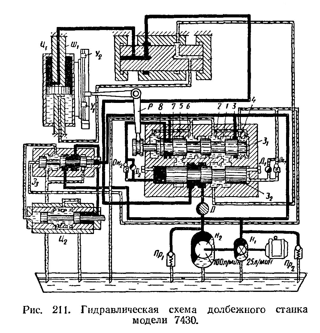 В кінці холостого ходу долбяка нижний переставной упор У1, воздействуя на рычаг Р, перемещает золотник 31 влево. В етот момент часть масла от насоса подач Н1 через выточки 3 і 4 і обратный клапан Ок1 поступает под правый торец золотника 32 і смещает его влево; при етом масло от насоса Н2 через дроссель Д і правую выточку золотника 32 будет поступать в правый канал поворотного сальника С і в нижнюю полость робочого цилиндра Ц1, осуществляя рабочий ход долбяка. Масло, находящееся в верхней полости цилиндра Ц\, через левый канал сальника, левую выточку золотника 32 і выточки 5 і 6 золотника 31 будет сливаться в бак. По окончании робочого ходу долбяка верхний переставной упор У2 рычагом Р сместит золотник 31 вправо; при етом часть масла от насоса Н1 подач через выточки 7 і 8 і обратный клапан Ок2 поступит под левый торец золотника 32 і переместит его вправо; в етом случае долбяк будет совершать холостой ход, повторяя цикл роботи.