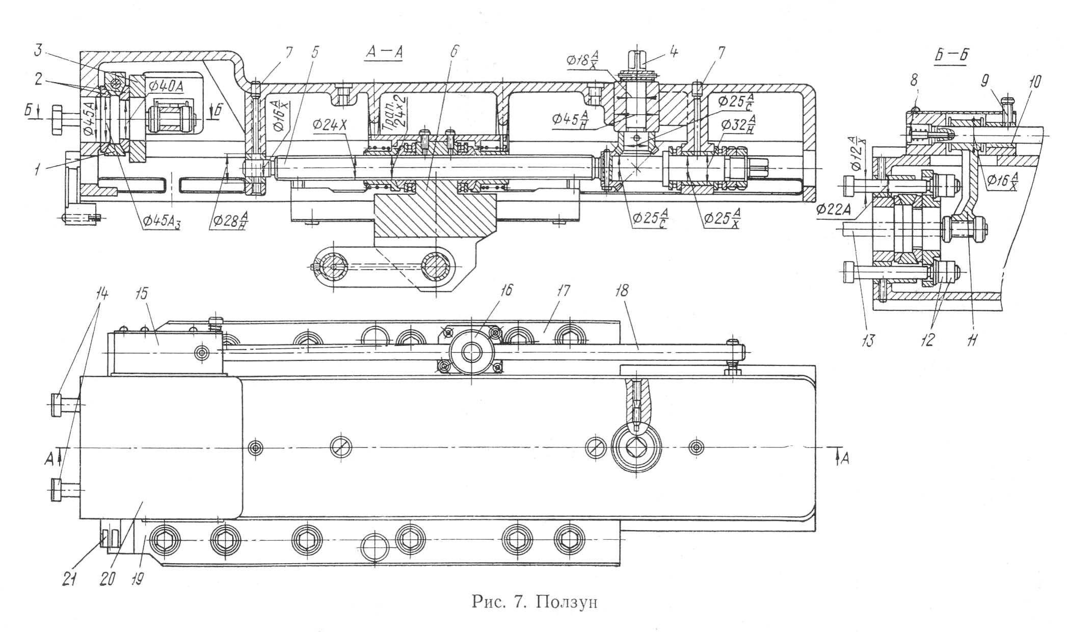 К передньої частини ползуна крепится супорт посредством конусного кольца 2, хомута 1, планки 3 і стяжных болтов 14 з гайками 12. Зажимается супорт через квадрат гвинта 21 з передньої правой стороны ползуна.
