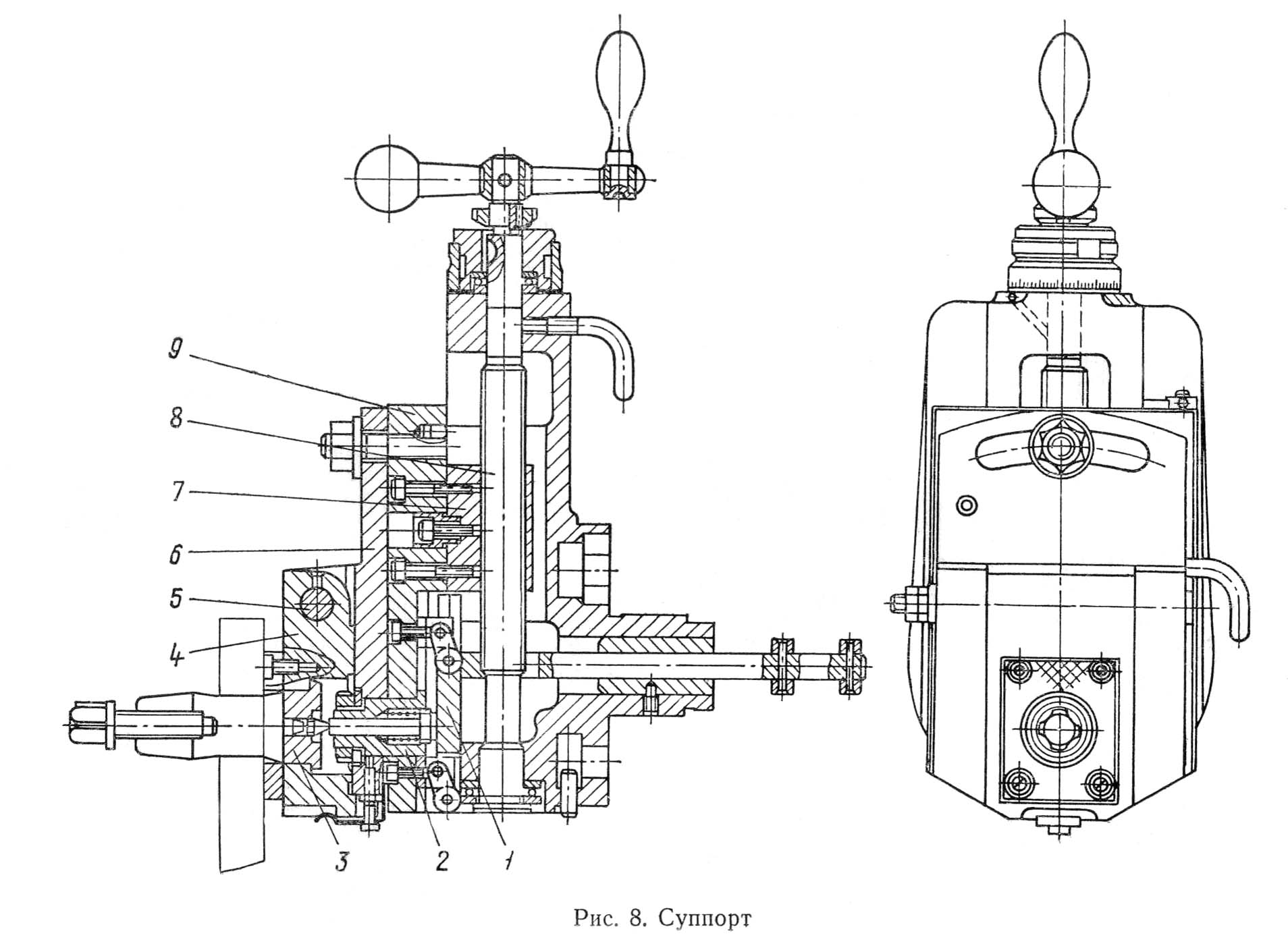В передньої частини корпуса суппорта расположены направляющие в виде ласточкина хвоста, по которым перемещаются салазки суппорта 9. Перемещаются салазки з помощью рукоятки через винт 8 і гайку 7. Перемещения салазок отсчитывают по лимбу.