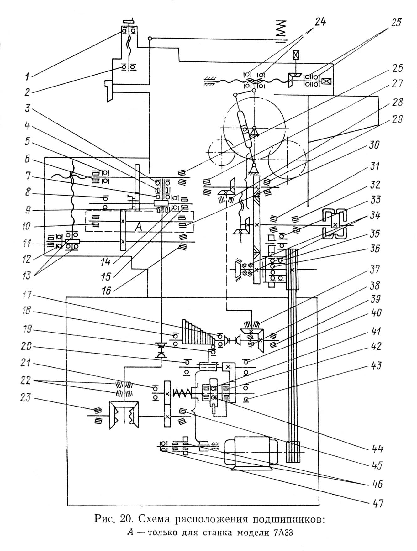 Схема розположення підшибників строгального верстата 7А33. Дивитись у збільшеному масштабі