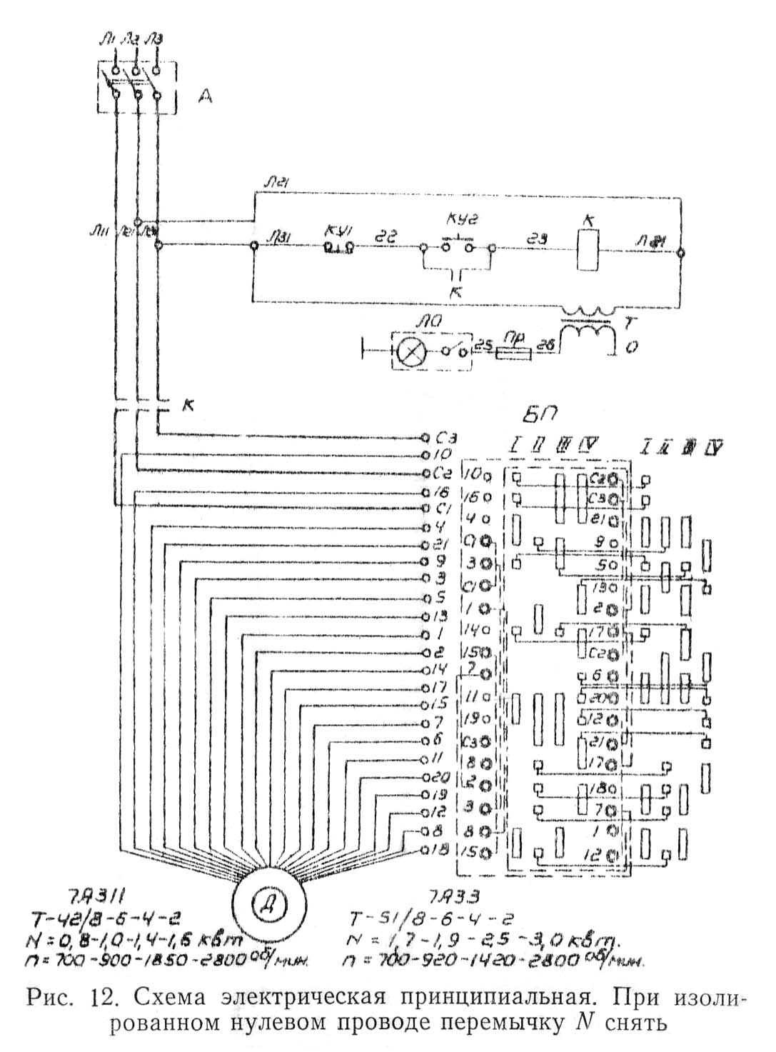 Пускать електродвигатель головного приводу М следует нажатием кнопки керування «1» (22—23), которая замыкает ланцюг катушки контактора Р (23—С1), переводя его на самопитание. При етом необходимо предварительно установить необходимую скорость обертання електродвигуна посредством рукоятки переключения контроллера В2. Електродвигун головного приводу М останавливать нажатием кнопки керування «О» (В1—22).
