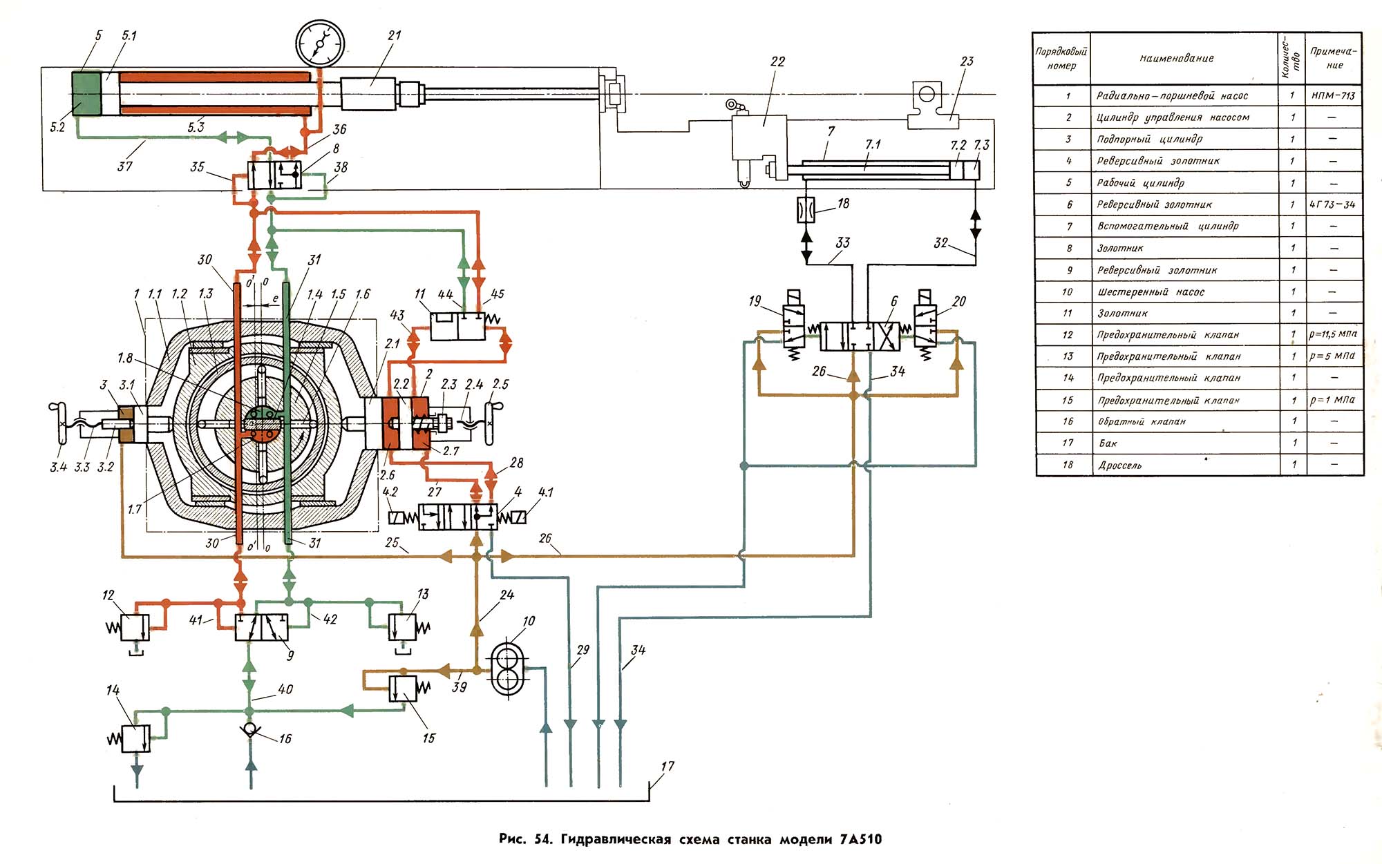 Гідравлічна схема протяжного горизонтального верстата 7А510. Дивитись у збільшеному масштабі