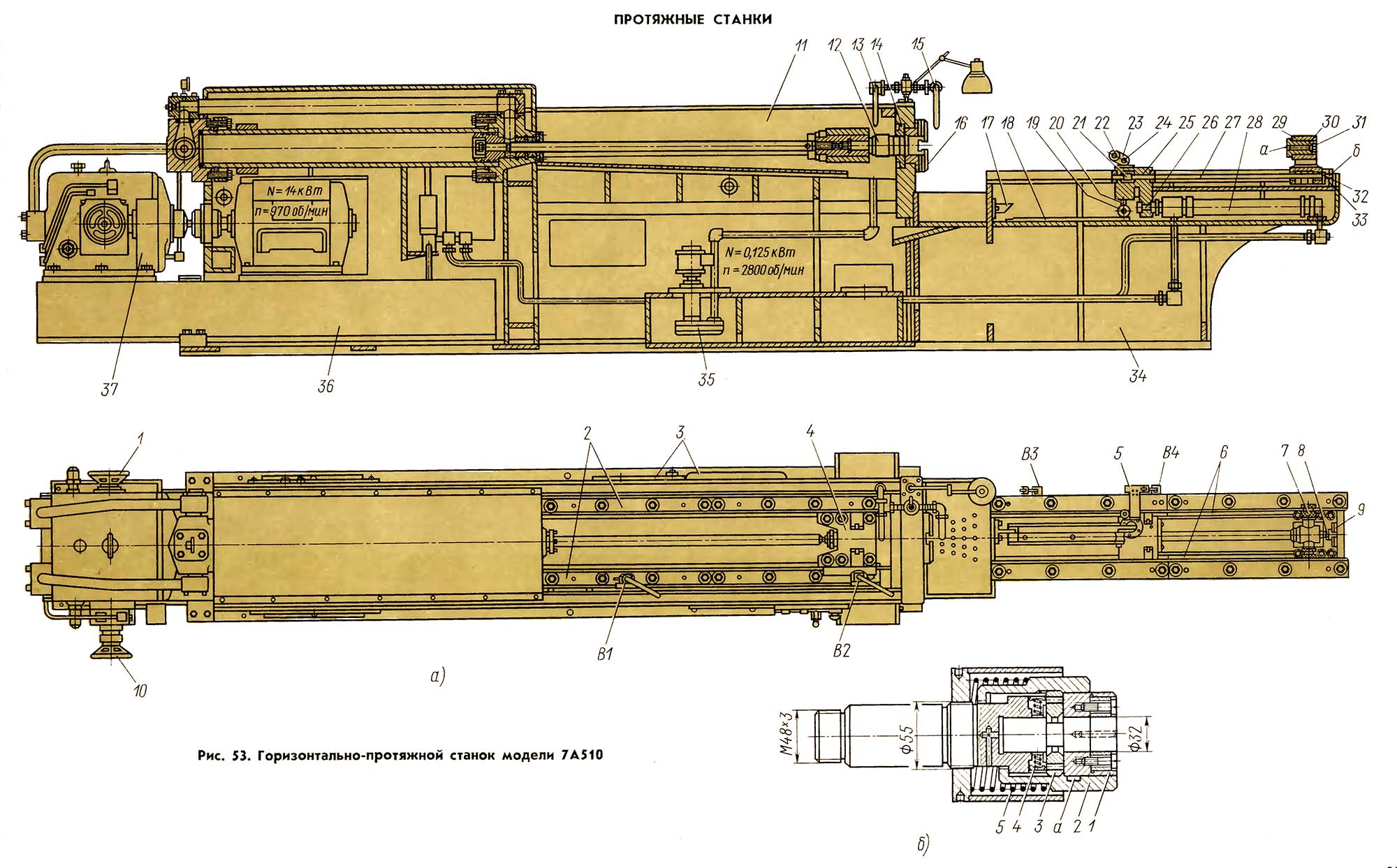 Розташування складових частин протяжного верстата 7А510. Дивитись у збільшеному масштабі