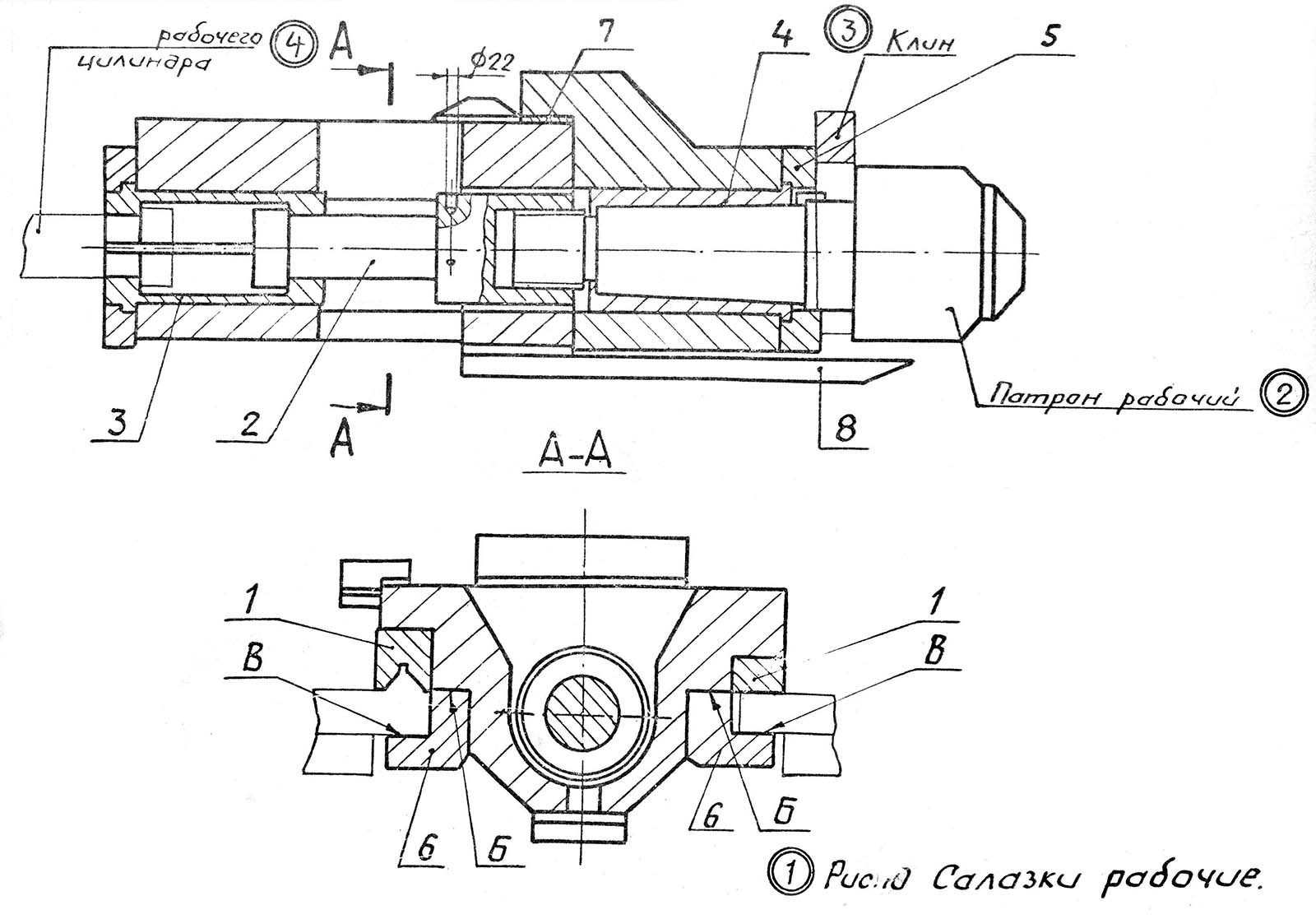 Салазки рабочие служат для переміщення робочого патрона, поддержки штока робочого цилиндра і связи штока з рабочим патроном. Представляют собой чугунную отливку з привернутыми бронзовыми направляющими планками I. Салазки разгружены і не передают тягового зусилля. Это достигается за счет гайки 2 разрезной втулки 3, связывающих между собой шток робочого гідроцилиндра і хвостовик робочого патрона.