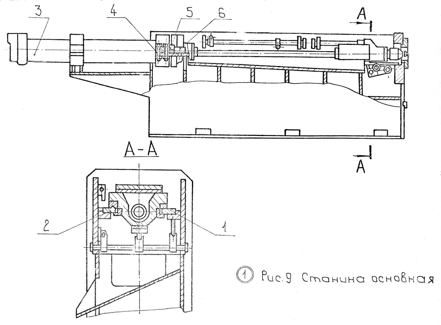 В задньої частини станины на постельные планки устанавливается рабочий цилиндр 3. Необходимая жесткость крепления цилиндра обеспечивается призонными гвинтами 4 і клиньями 5, установленными между хомутом передньої крышки цилиндра і неподвижными упорами 6, закрепленными к постельным планкам. В передньої частини станины имеется склиз, по которому стружка з охлаждающей жидкостью выводится наружу в приемный ящик для стружки.