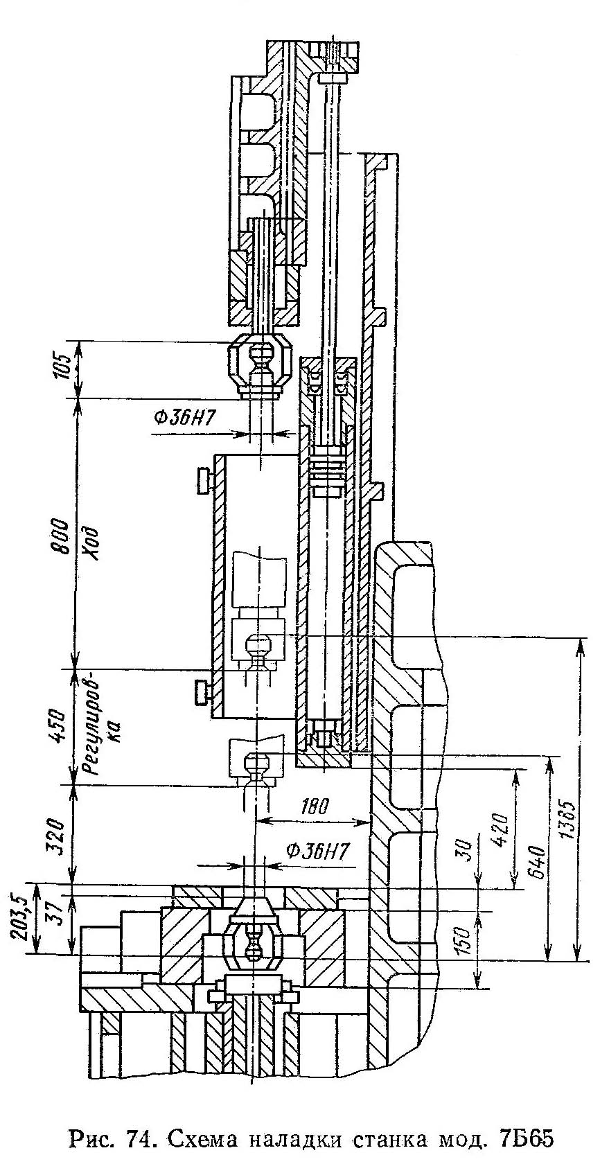 Схема налагодження верстата 7Б65 приведена на рис. 74. На ней приведены все данные, необходимые для согласования размеров инструмента і установочных пристосувань з параметрами верстата.
