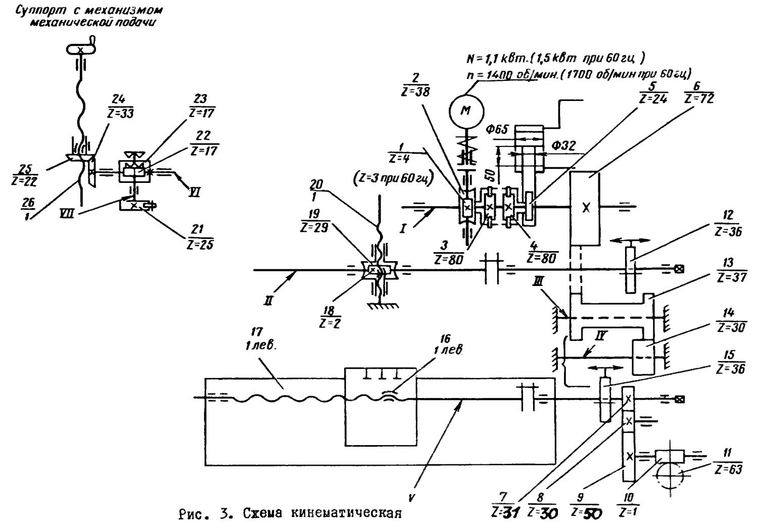 При движений ползуна в обратном направлении в кінці ходу ролик 4 находит на упор I (см. рис. 4) і через храповое колесо 6 (см. рис. 14), винтовую зубчатую пару 22 і 23 (си. рис. 3) і коническую передачу 24 і 25 вращение передається ходовому винту суппорта 26.