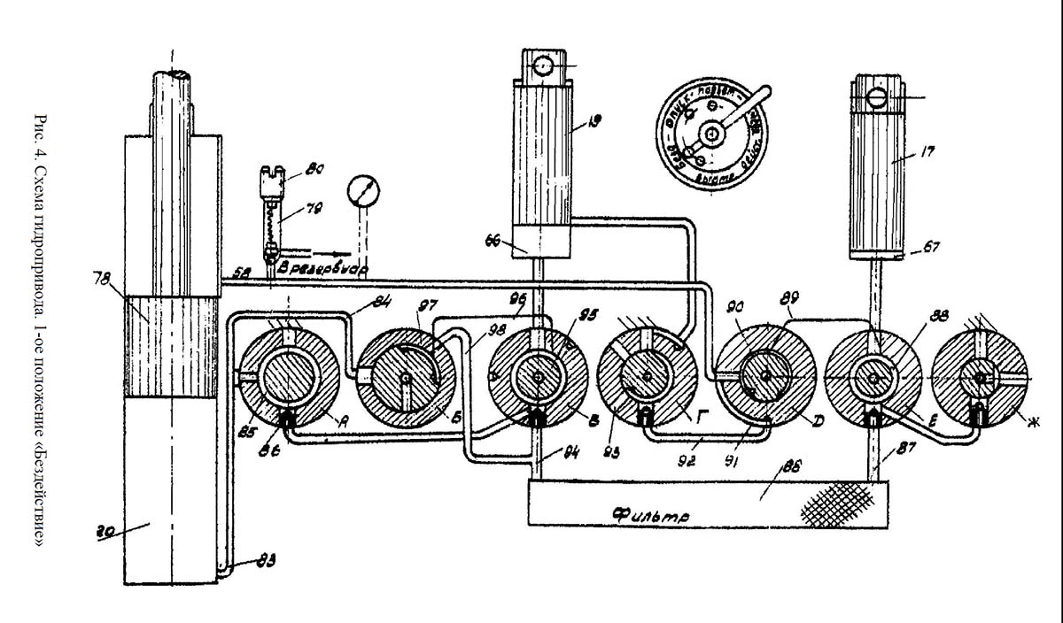1-е положение «Бездействие» (черт. №3). В етом положении рукав, связанный з поршнем 78 робочого цилиндра 20, неподвижен.