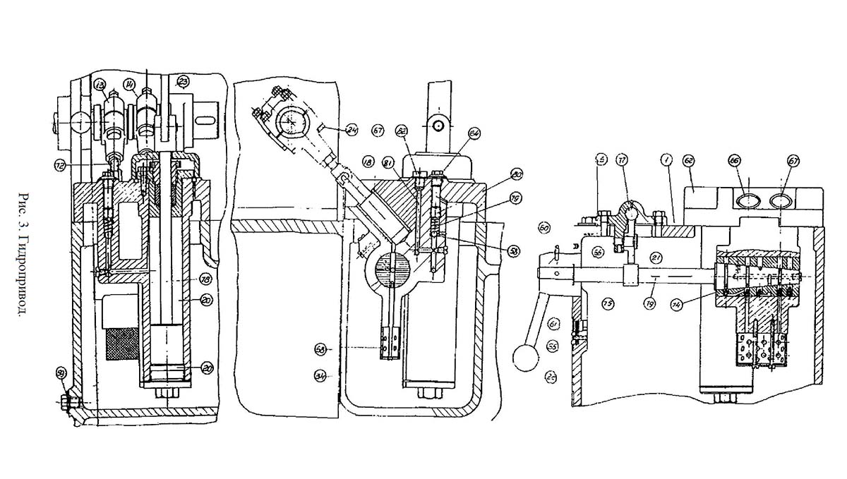 В корпусе гідронасоса расточены 2 наклонных цилиндра 66 і 67 з запрессованными в них биметаллическими втулками. Поршни 17 і 18 цилиндров 66 і 67 получают рух посредством тяг 72 і 73 от підшибників 13 і 14, сидящих на валу II. Поршни 17 і 18 засасывают масло из резервуара 34 через фильтр 68 і нагнетают через каналы втулки крана 74 і пробки крана 19 в рабочий цилиндр 20.