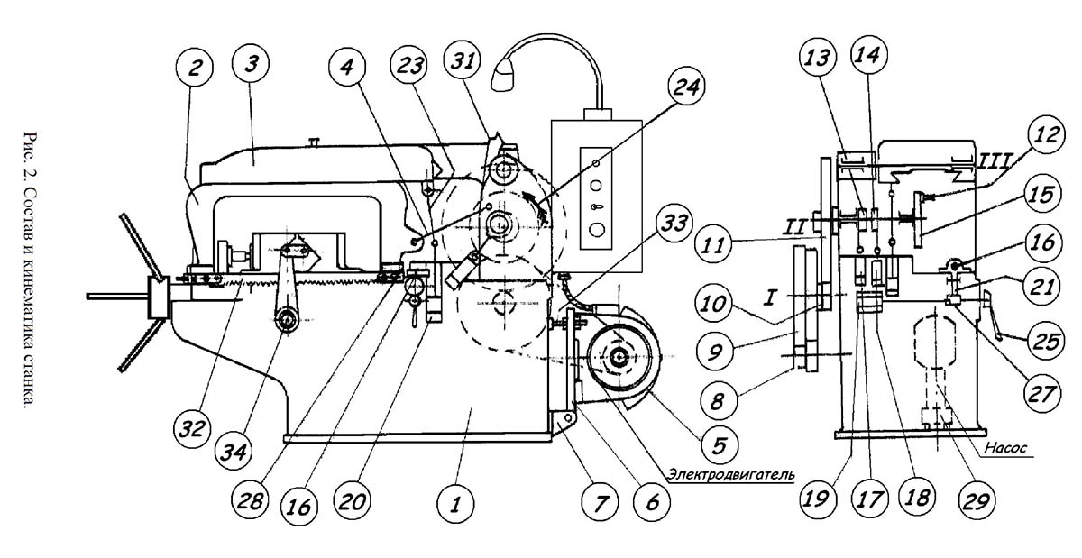 На валу II на шпонке крепится кривошипный диск 15 з пальцев кривошипа 12. От него посредством шатуна 4, пильная рама 2 получает возвратно – поступательное рух з числом двойных ходов, соответствующее числу оборотів вала II. На валу II установлены підшипники 13 і 14, передающие рух поршням 17 і 18 гідравлічного насоса посредством тяг з шарниром.