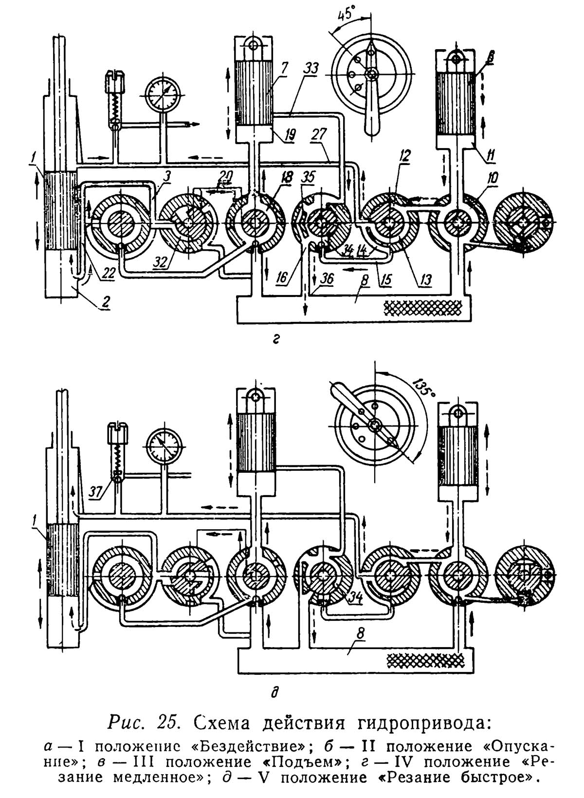 Керування гідроприводом производится рукояткой 14, которая може быть зафиксирована в пяти положениях: 1 — «Бездействие», 2 — «Опускание», 3 — «Подъем», 4 — «Резание медленное», 5 — «Резание быстрое».