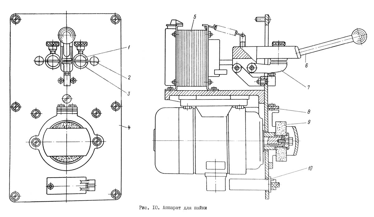 Аппарат для пайки (рис. 10), предназначенный для пайки ленточной пилы і отжига після пайки, смонтирован на специальной панелі 4. Узел состоит из паяльной частини аппарата, шлифовального круга 9 для зачистки аилы, расположенного внизу панелі, калибра 8 для проверки толщины места спая пилы і выдвижного лотка 10, в котором содержатся припой