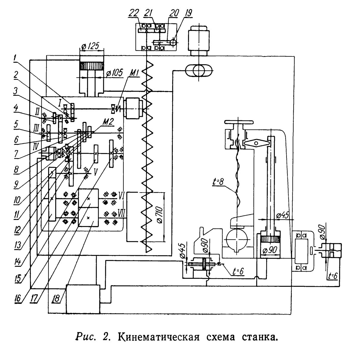 Шпиндель пильной бабки имеет шесть швидкостей, которые можно получить различными комбинациями положений двух блоков шестерен. Рух от фланцевого електродвигуна мощностью" 7,5 кВт через муфту M1 передається на вал I. От вала I через зубчатую передачу 1 і 2 рух получает вал II, на котором свободно посажен двухступенчатый блок-шестерня 3, 4. В зависимости от положения блока передача обертання на вал III може осуществляться через шестерни 3, 6 или 4, 5. Таким образом, вал III получает две скорости обертання. Вал IV получает вращение от вала III посредством зацепления трехступінчастого блока 7, 8, 9 поочередно з шестернями 10, 15 і 16. Следовательно, вал IV имеет шесть швидкостей обертання. Далее рух передається на вал V через шестерни 12 і 13, з вала V на вал VI, косозубую пару 11, 14 і пару шестерен 17, 18 на шпиндель VII, на кінці которого установлена сегментная пила. Для предохранения от перегрузок на валу IV установлена предохранительная кулачковая муфта М2.