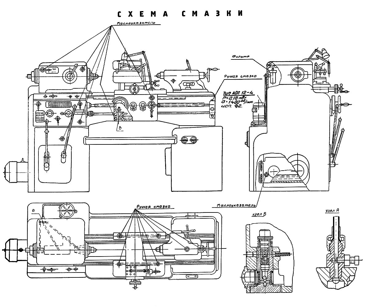 Смазка механізмов верстата осуществляется маслом «Индустриальное 20» ГОСТ 1707—51. Смазка передньої бабки осуществляется от шестеренчатого маслонасоса, установленного в задньої частини правой тумбы за станиной. Через фильтр смазка подается в бабку, где через каналы, просверленные в корпусе, і трубки разводится к підшипникам ишестерням.