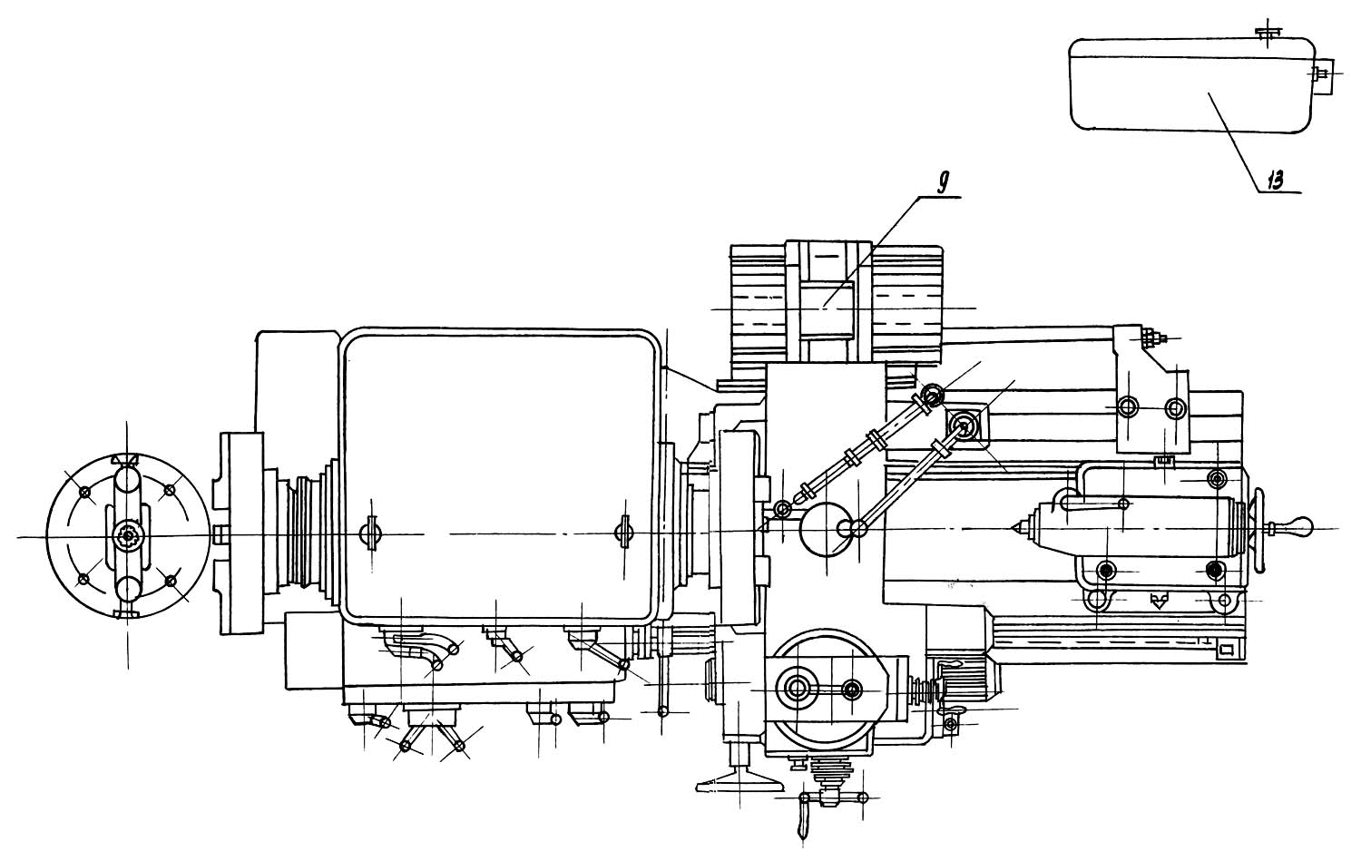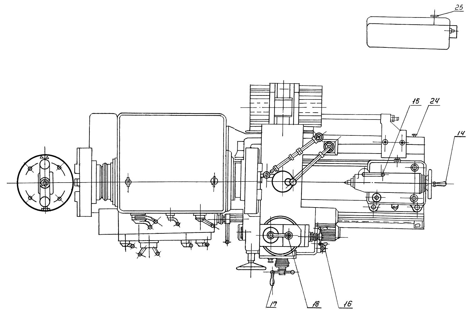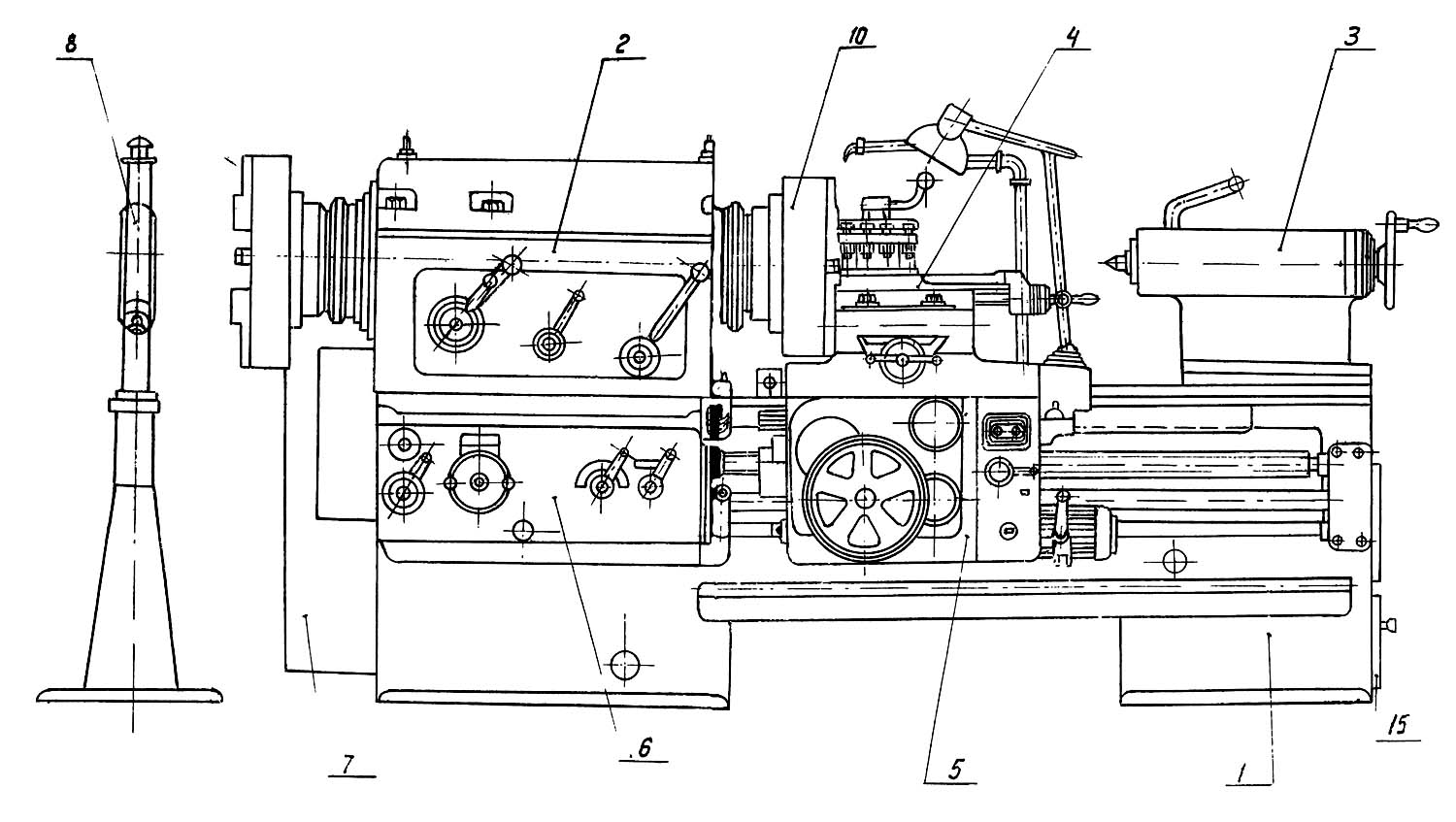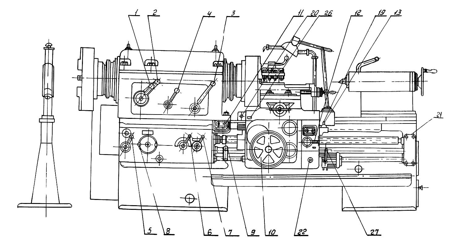 Розташування складових частинин трубонарізного верстата 9М14. Дивитись у збільшеному масштабі
