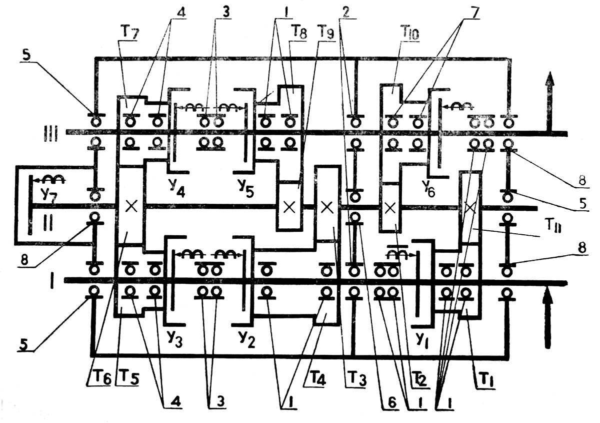 Муфта 7 (ЭТМ 56) установлена на среднем валу і предназначена для исключения проворота выходного вала при отключенных остальных муфтах і вращающемся входном вале.