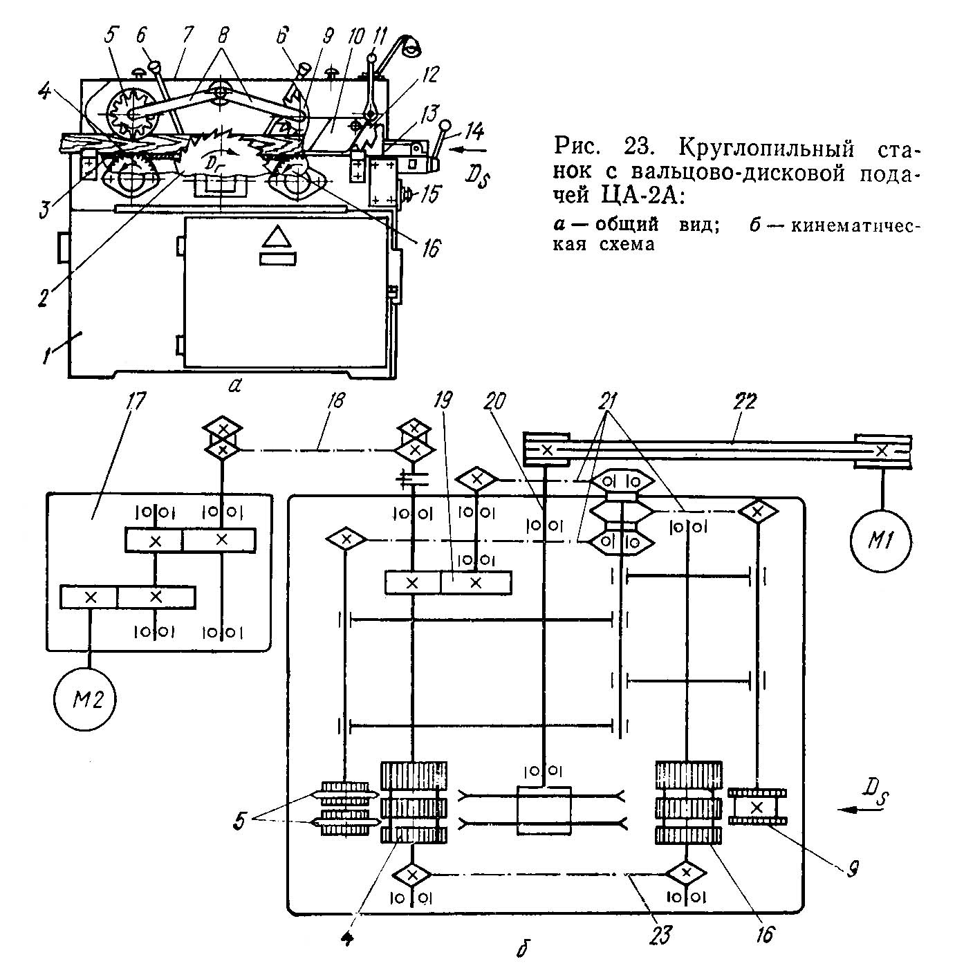 На кінематичної схеме верстата видно, что пильный вал 20 вращается от електродвигуна Ml. Вальцы і подающие диски механізма подачі приводятся во вращение от многоскоростного електродвигуна М2 з частотой обертання 700, 900 і 1350 об/мин.