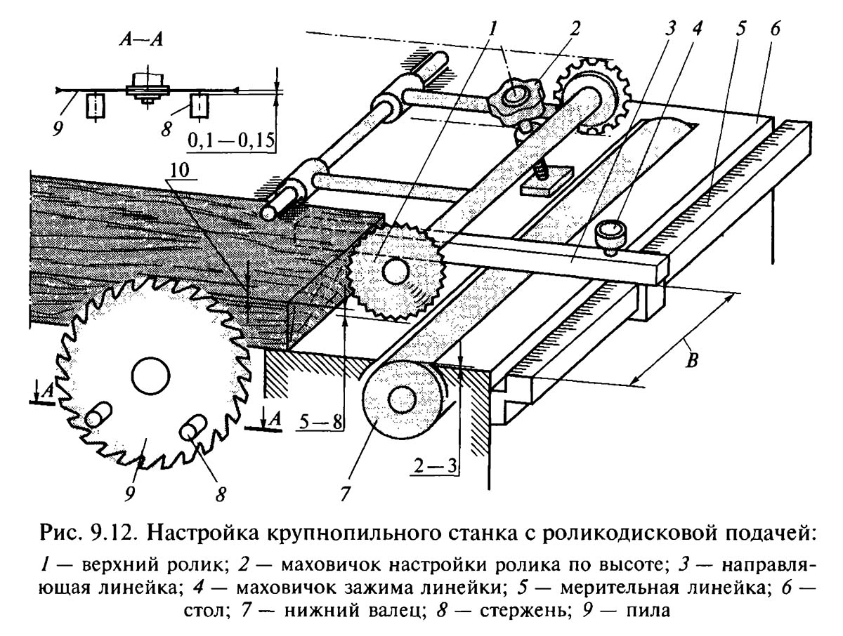 Положение нижних подающих вальцов регулируют в зависимости от влажности і породы распиливаемой древесины. При пилении древесины мягких хвойных пород величина выступа нижних вальцов 7 над столом 6 равна 2..3 мм, твердых лиственных пород — 1..2 мм. При регулировке переставляют підшибниківые опори осей вальцов в станине верстата. Точность положения вальцов проверяют контрольным бруском і щупом.