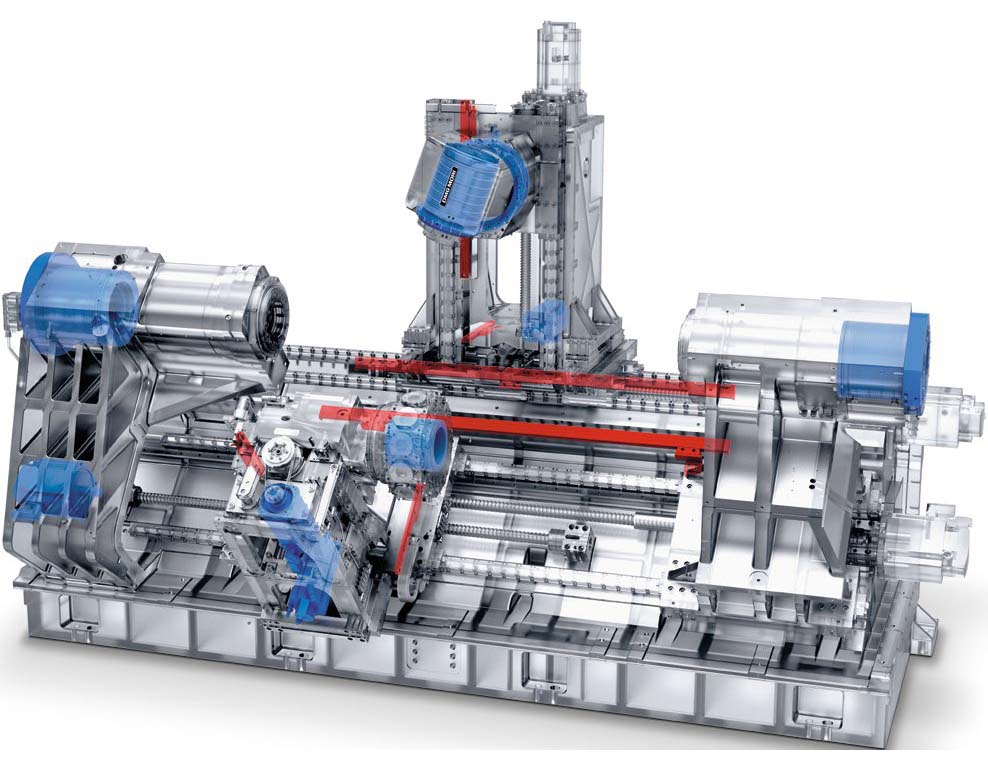Лінійний привід – високодинамічний привід для максимальної динаміки та довготривалої точності по осі X (верхня револьверна головка). Привід із високим швидкісним ходом до 60 м/хв та прискореннями до 1,5 g скорочує допоміжний час до мінімуму. Лінійний привід складається з лінійних направляючих та лінійного двигуна, вузол ШВП виключений і сила тертя наближається до 0.