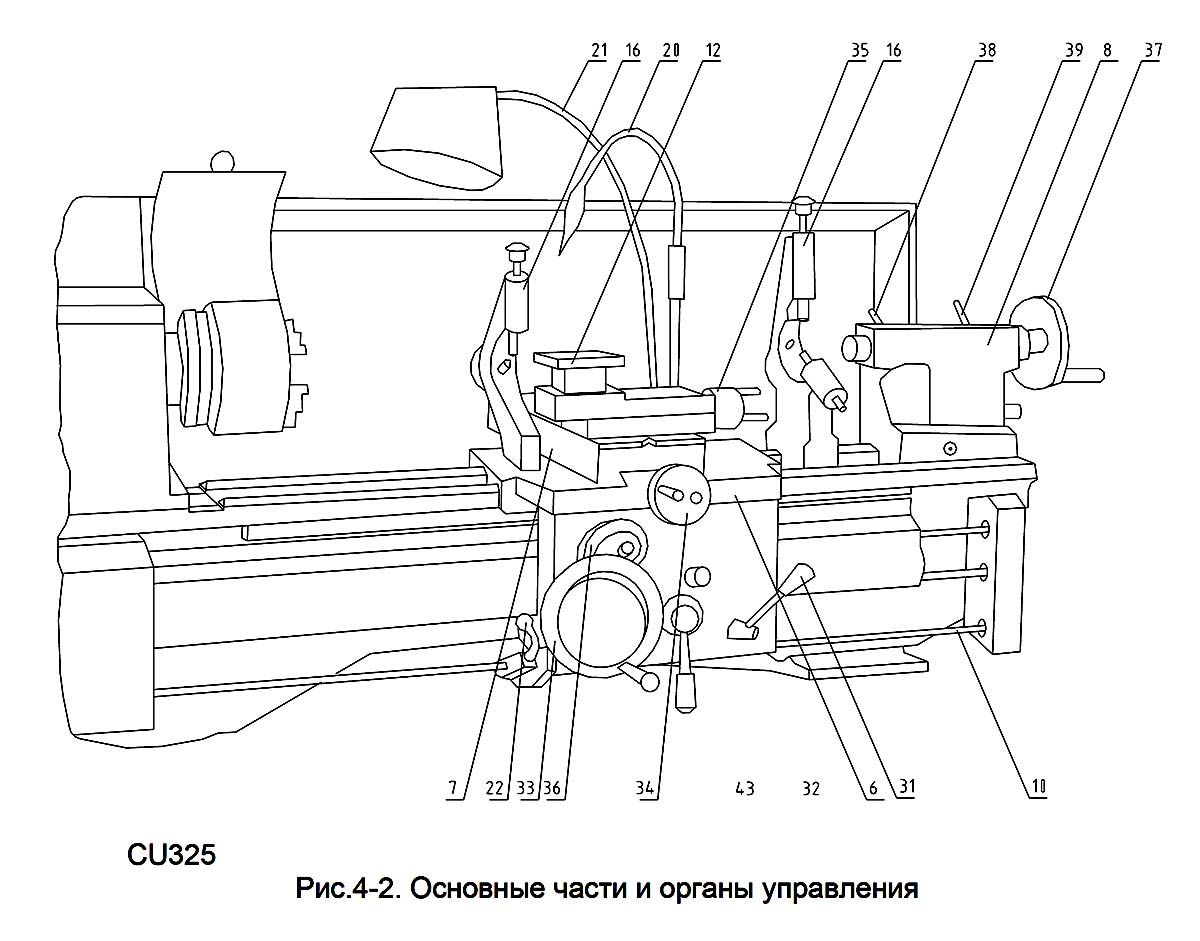 Розташування органів керування токарним верстатом CU-325. Дивитись у збільшеному масштабі