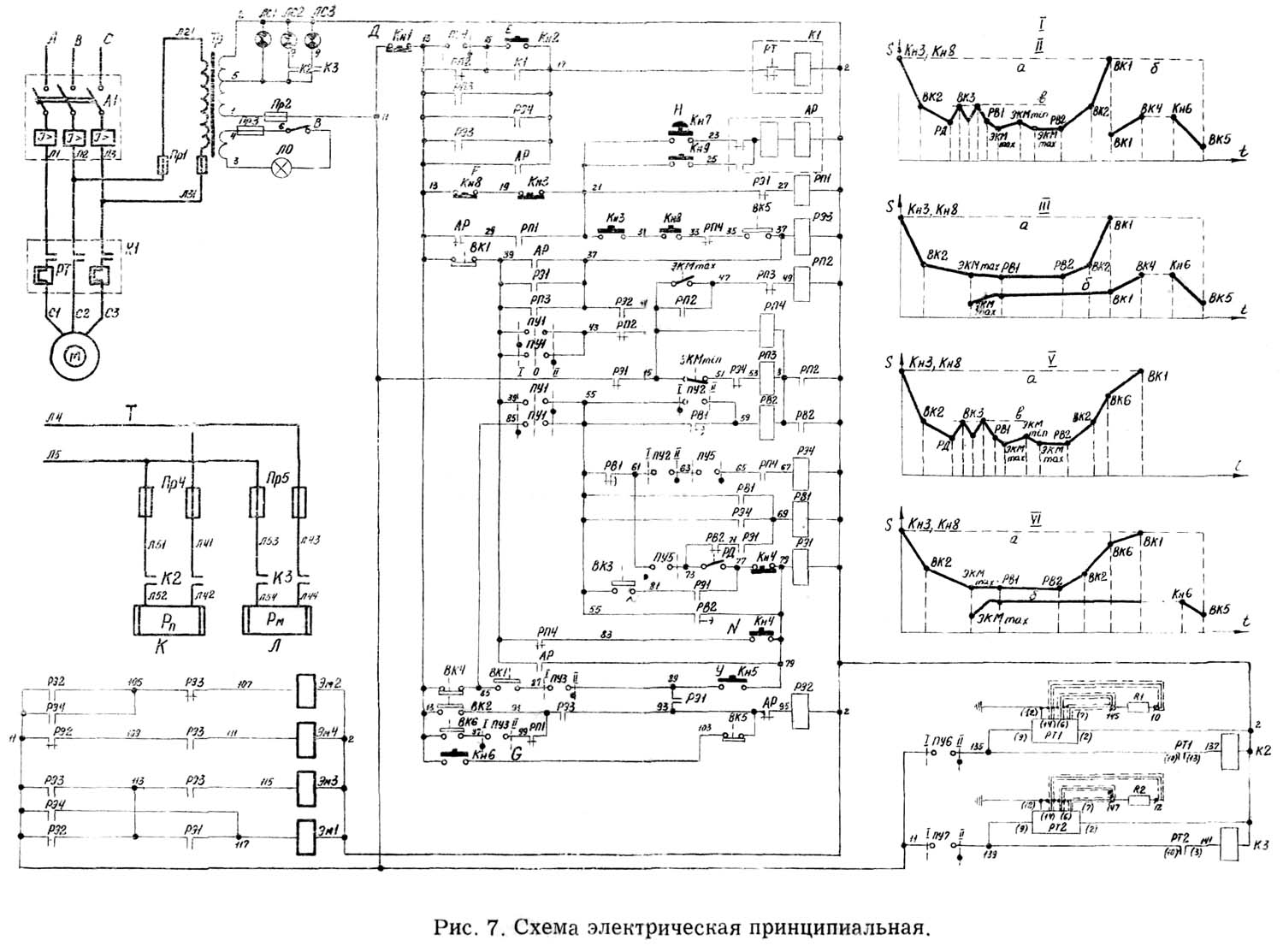 При нажатии на кнопку Кн7 включится реле АР, которое своими замыкающими контактами в точках 13—17, 39—37 і 39—79 включит магнитный пускатель К1 і реле РЭ1 і РЭ3. Магнитный пускатель К1 своими замыкающими контактами включит електродвигатель гідроагрегата, а реле РЭ1 і РЭ3 своими замыкающими контактами в точках 113—117, 11—113, 113—115 і 109—111 включат ланцюги живлення електромагнитов Эм1, Эм3 і Эм4. После увімкнення електромагнитов ползун независимо от места положения начнет быстро подниматься до срабатывания конечного выключателя ВК1 в точках 13—39. После того, как будет выяснена причина роботи аварийным разъемом (аварийным разъемом следует пользоваться только в аварийных случаях), следует открыть електрошкаф і нажать на кнопку Кн9 «Деблокировка», т. е. возвратить реле АР в исходное положение, иначе роботи електросхеми, а следовательно і пресса, будет невозможна.