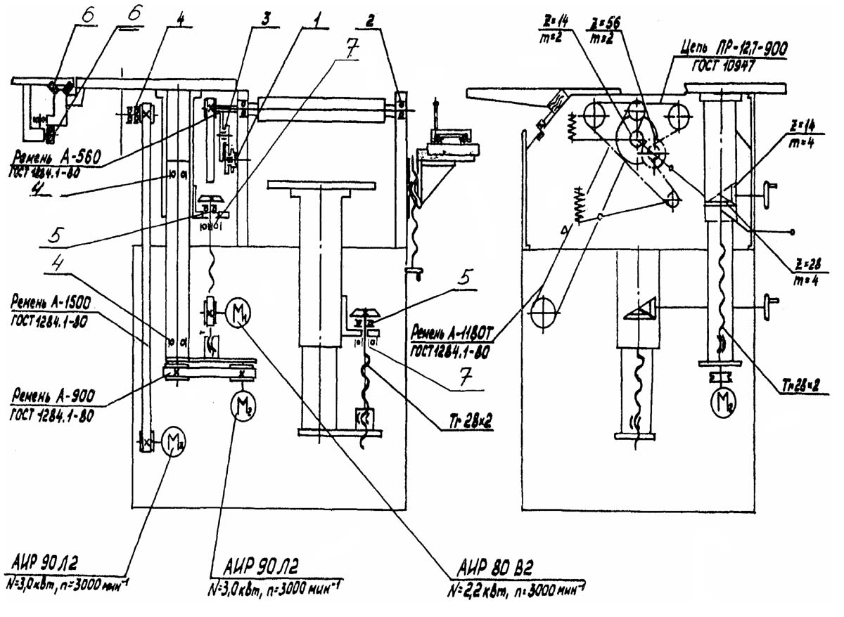 Електродвигун приводу установлен на подмоторной плите. Натяжение ремня осуществляется переміщенням плиты на двух скалках, которые після регулировки фиксируются.